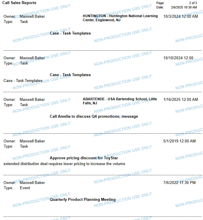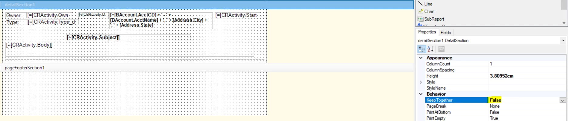 We have a Call Sales Report in Report Designer that shows all of the notes/comments a sales rep has entered based on a date range. When the report is put into production and brought up as an axd the full report does not show. Clicking on the HTML also reveals that a major portion of the report is missing as the report should be several pages long, but only one page shows up. Even exporting the report as a PDF has missing parts of the report. In the Report Designer → Common Settings, PdfCompressed = TRUE, PDFFontEmbedded = TRUE, PrintAllPages = TRUE, ViewPDF = TRUE. I’ve tried using the ConvertHtmlToText = False, that cut off the headers (headers have the account number and business name for each visit) for each days entrys. CanGrow = True, CanShrink = True, CanSplit=True. Any suggestions as to how this can be fixed will be appreciated.