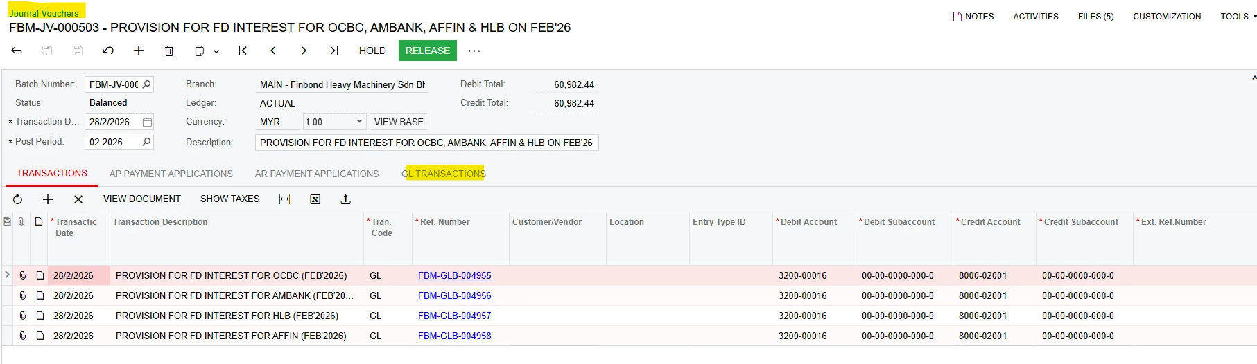 Inside the report, I wanted to see the GL Transaction, pulling it out from Journal Voucher > GL Transaction
