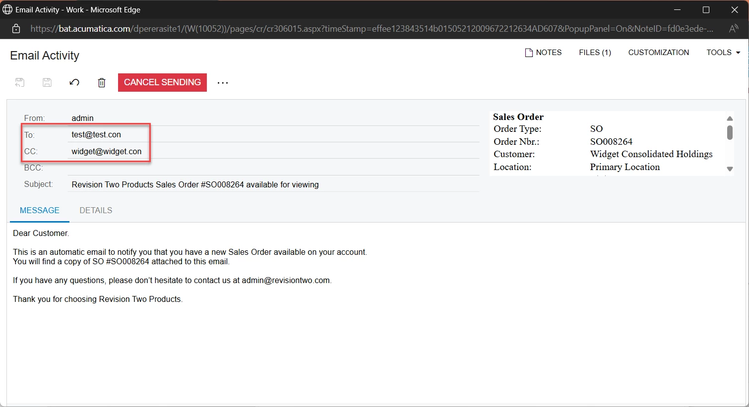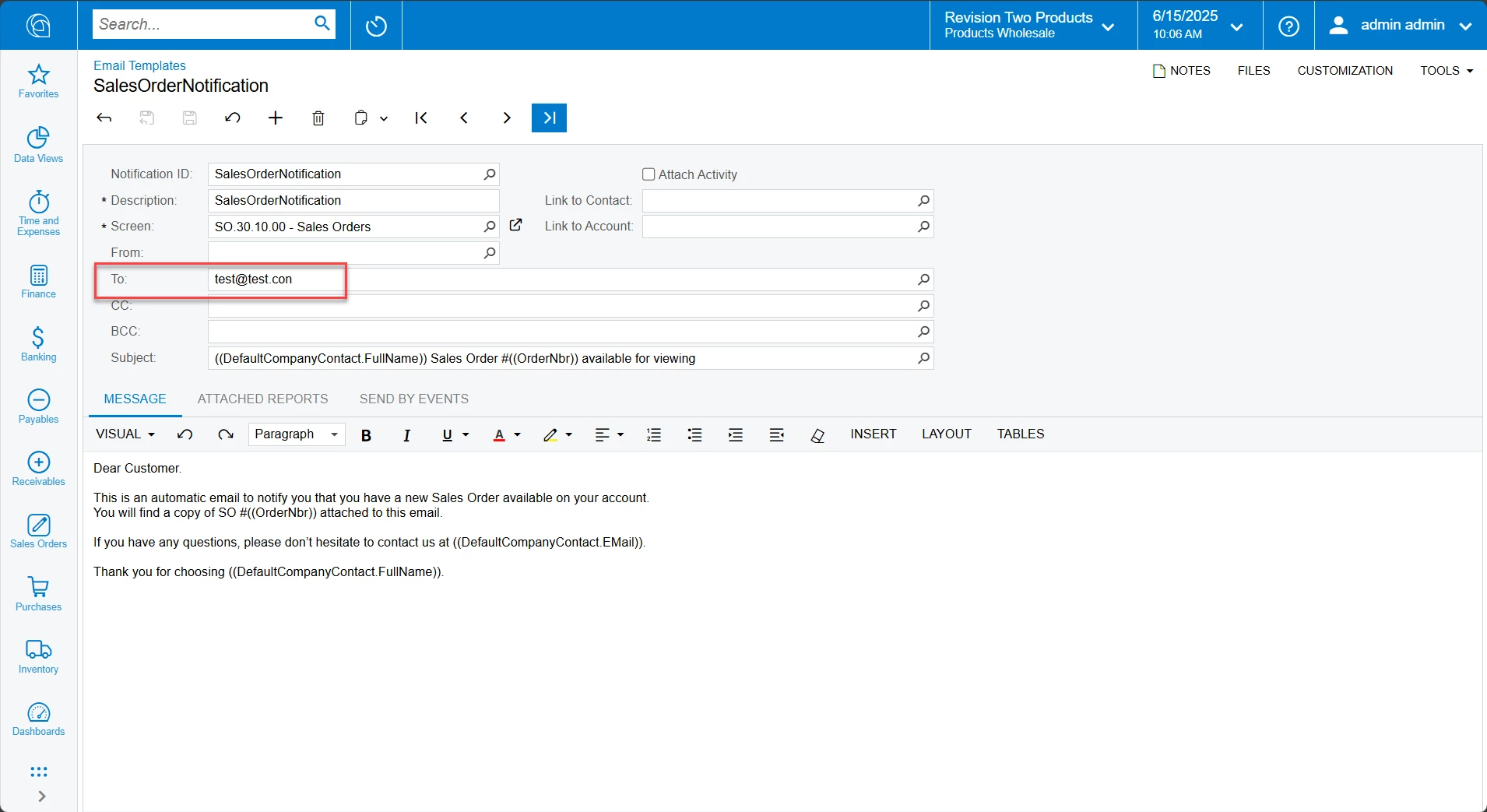 The Template has a message body, To fields set, From fields pulling from the Contact associated with the Sales order correctly.