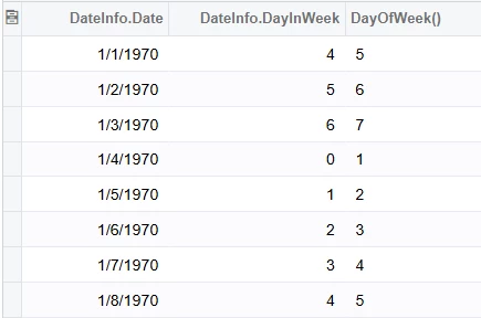 I’m totaling the number of weekdays in a month as part of this report. When testing performance, oddly, I found that DayOfWeek() returns 1-7 for Sunday-Saturday, while the DateInfo DAC calculates them as 0-6.