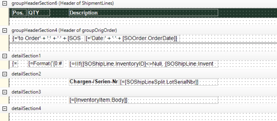 When I use a separate detail section for the lot/serial numbers in the report, Acumatica repeats the item line for each lot/serial number. This causes duplicate or multiple item lines, which is not desired.