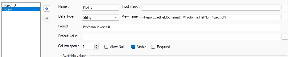 The report parameter is searching the PMProforma table to get the ProjectID.