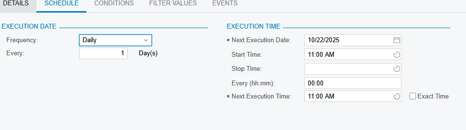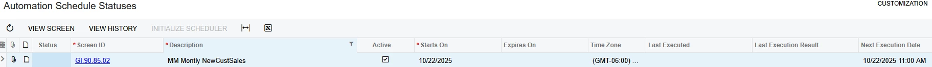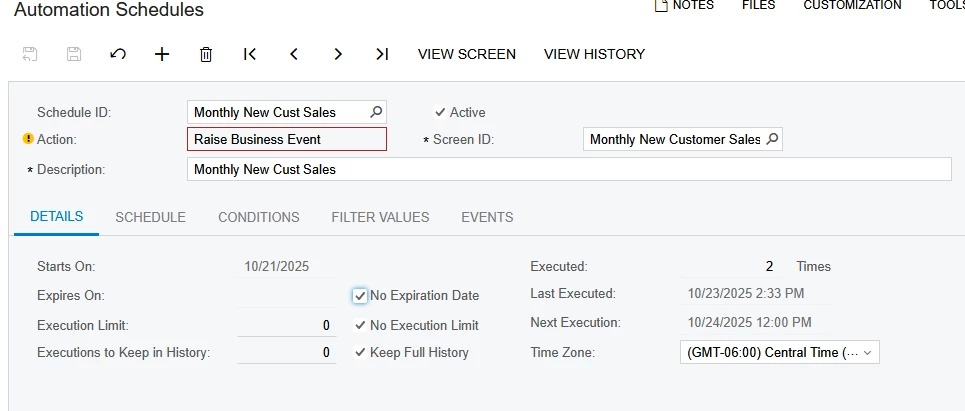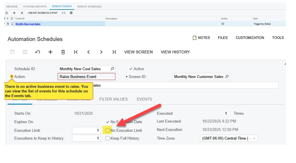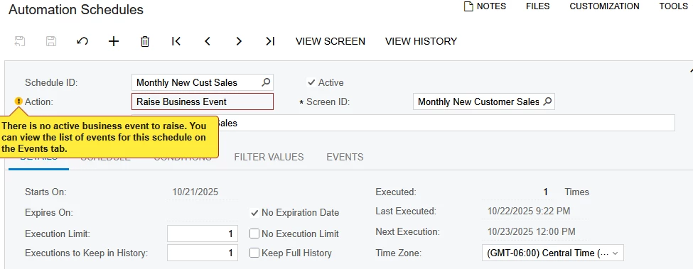 The automation schedule says it’s processing; but it’s on action and when i click the action button it doesn’t work. Events history show nothing. And the system queue shows that there is no back log in the queue and the other events we have are running flawlessly, but those were built by acumatica