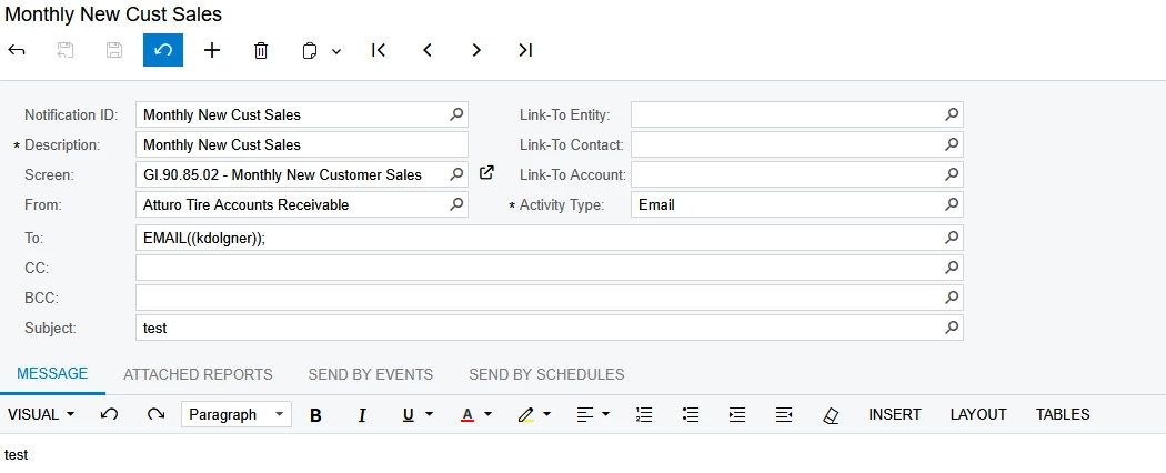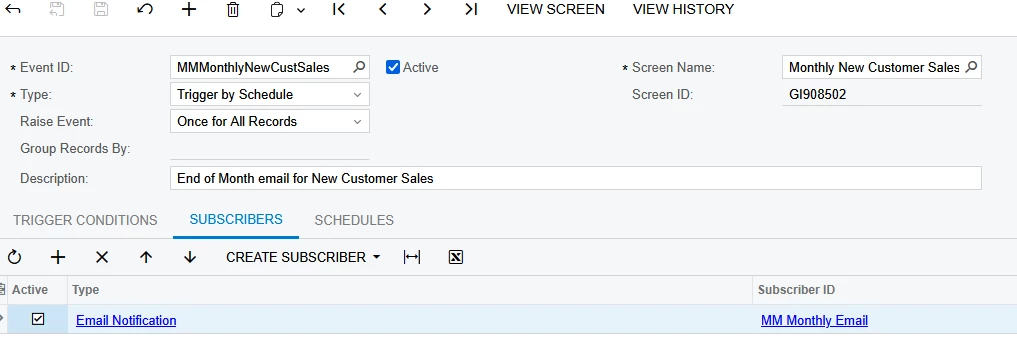 I usually start with “Trigger by Action” business event. This creates a button at the top of the generic inquiry and makes it easier to test. Once you know it works, THEN make it a “trigger by schedule”