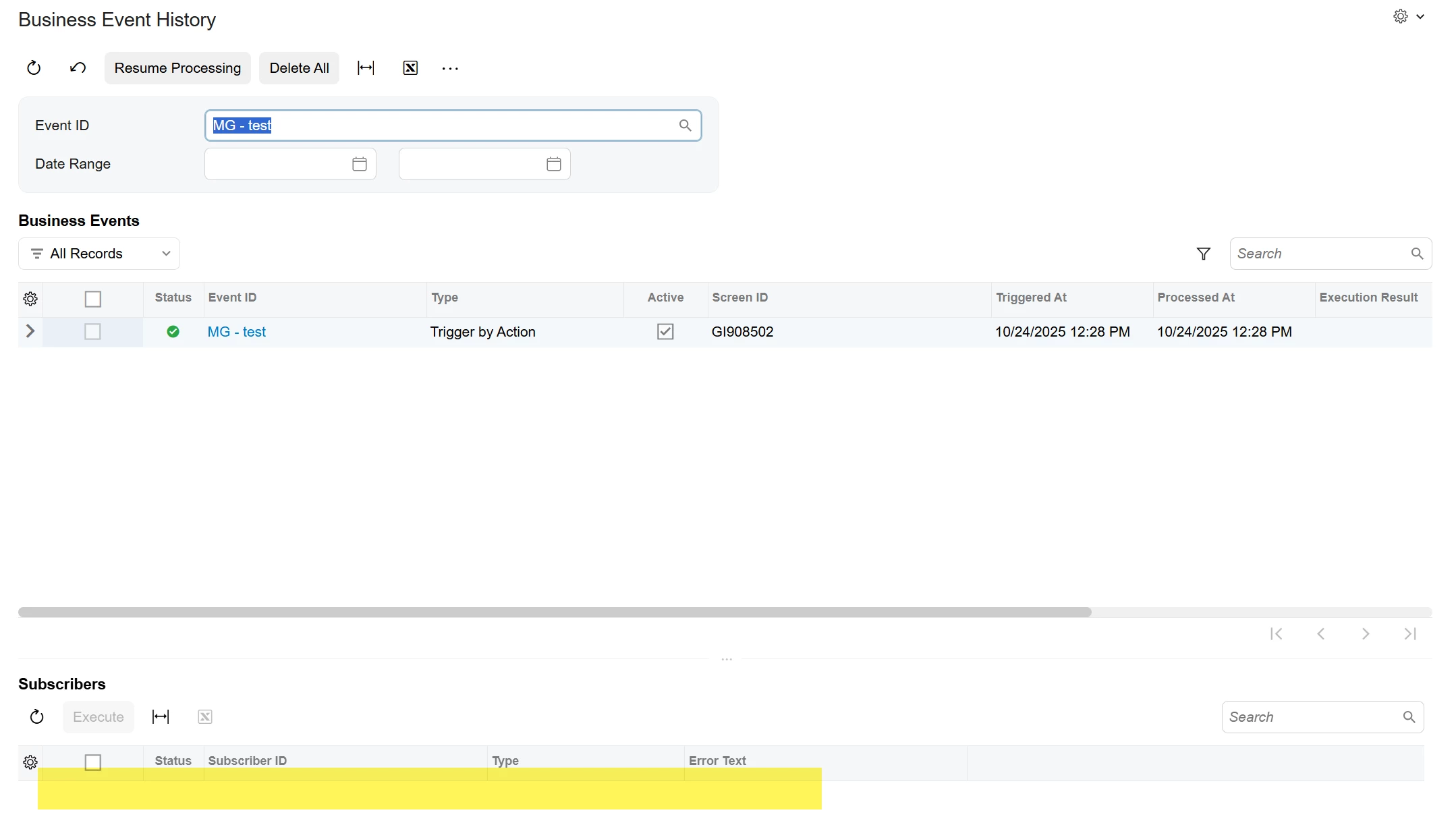So, business events run from your Admin user account (your partners account), not your specific user. There might be permissions set for your user, but maybe not your partner. Are you in 2025 R1 or R2? I’m not sure why you are getting an error when there is no subscriber. I tested this with 2025 R2.