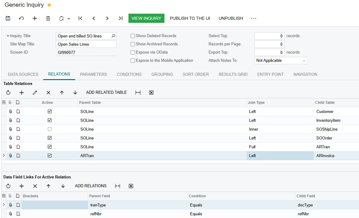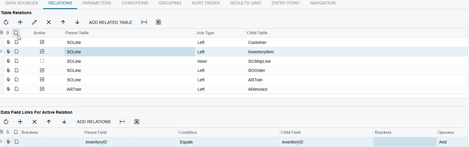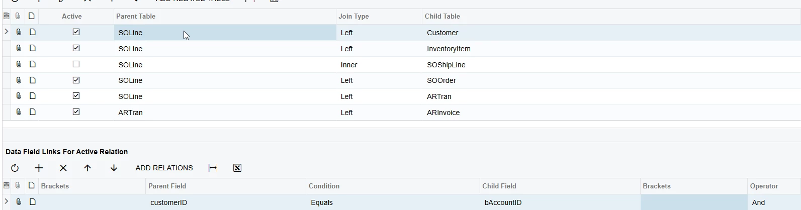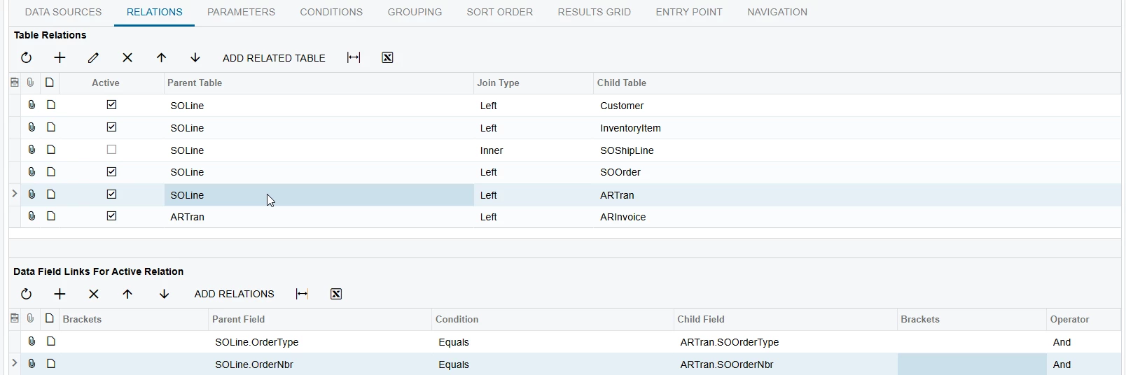 If some invoiced lines are still missing, verify in ARTran that the fields SOOrderType, SOOrderNbr, and SOOrderLineNbr are populated. If these fields are empty, the invoice was not created from the sales order and cannot be linked to SOLine.
