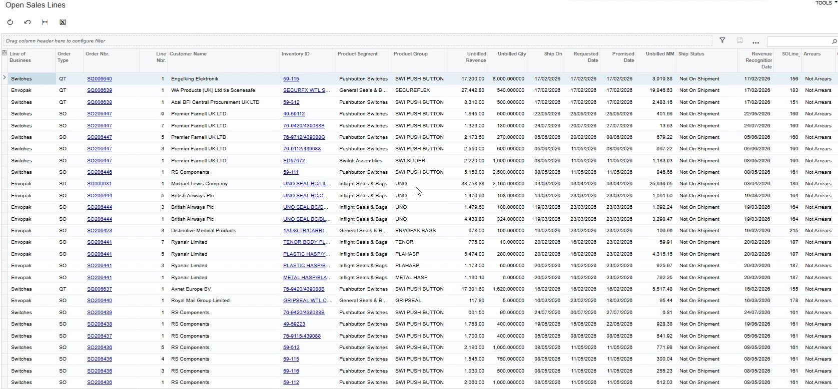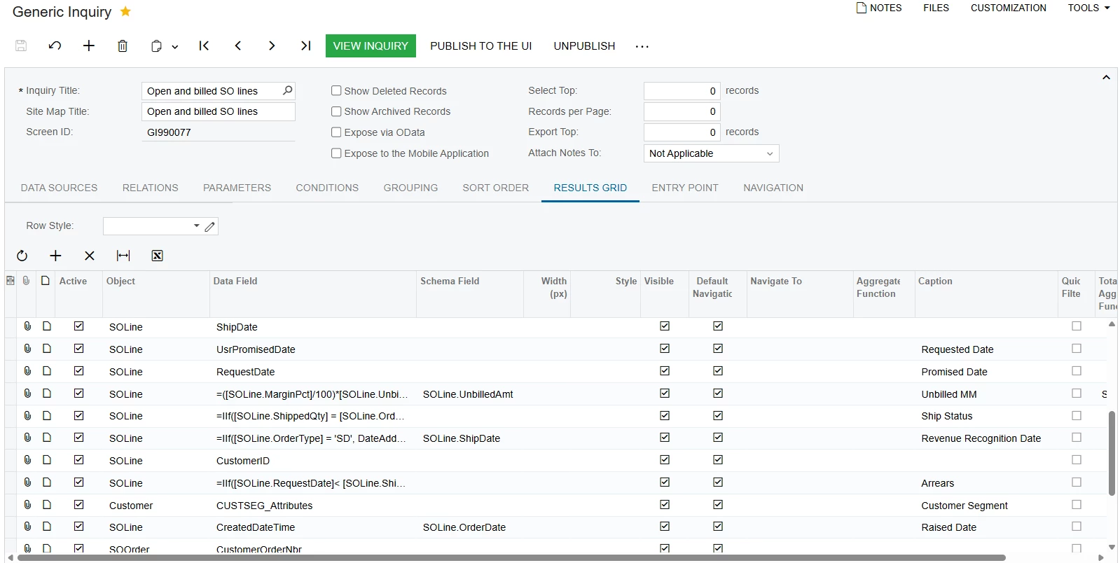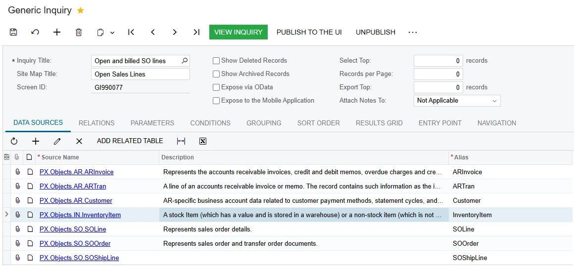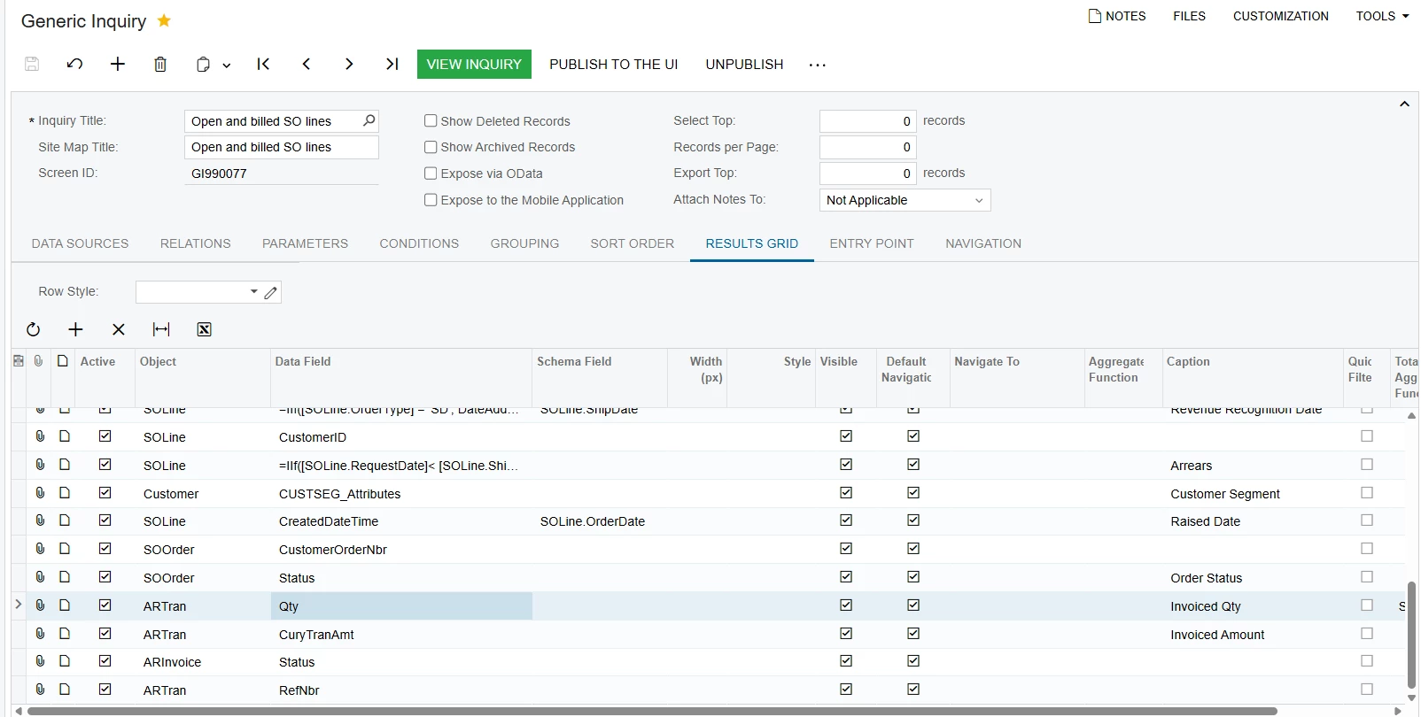 If some invoiced lines are still missing, verify in ARTran that the fields SOOrderType, SOOrderNbr, and SOOrderLineNbr are populated. If these fields are empty, the invoice was not created from the sales order and cannot be linked to SOLine.