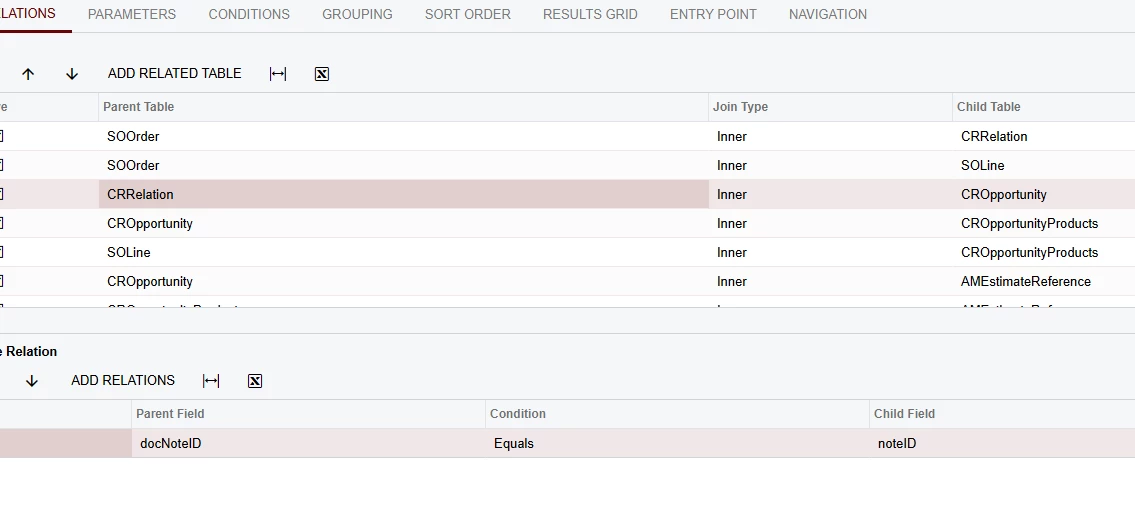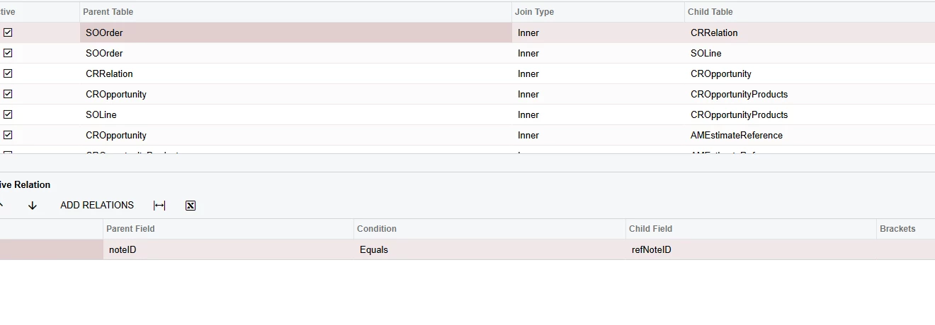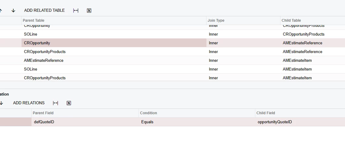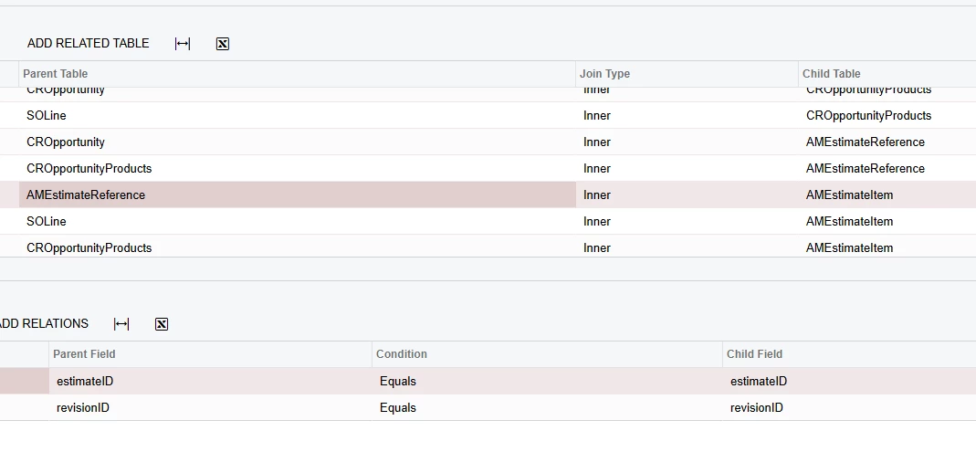 Is there anyone with you able to create a generic inquiry with the Relationship for SOOrder, CROpportunity, and AMEstimate. I am trying to create a generic inquiry where i can see what is the estimate cost, and the created SO Unit Price for per specific project.