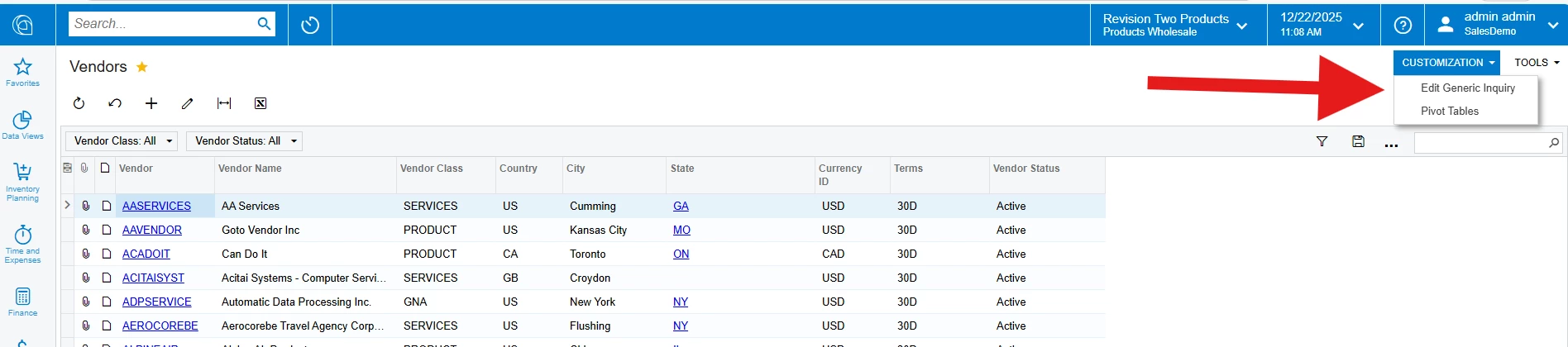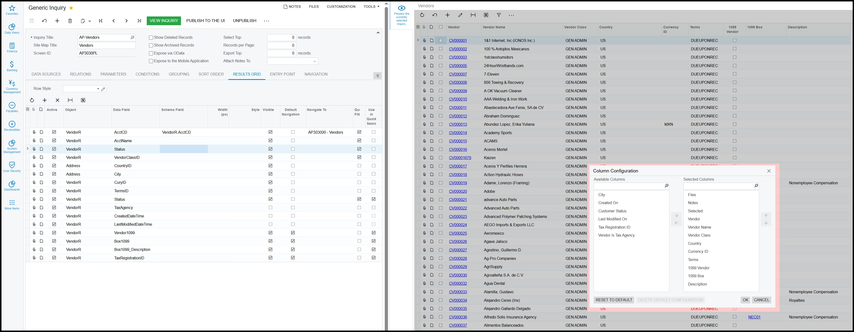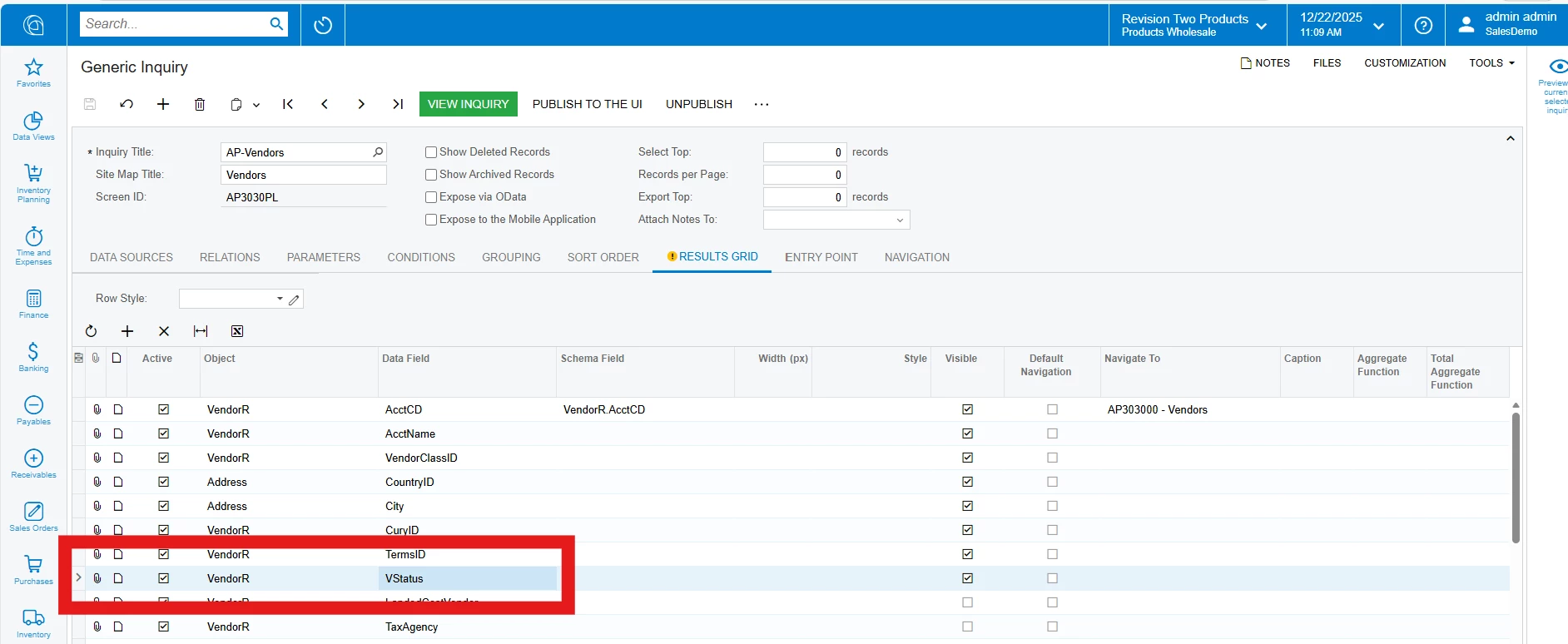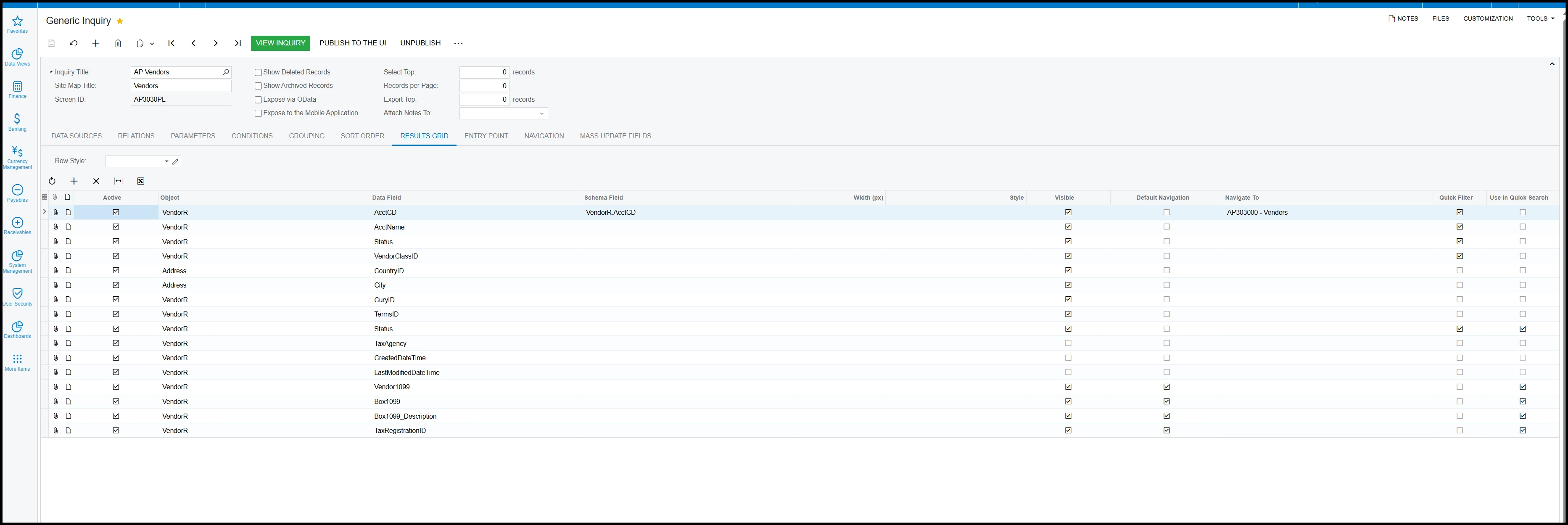We are trying to clean up old vendors from our list vendor but do not have a way to identify the VENDOR status without having to drill down and open each one which is rather inefficient and not as useful as “VENDOR” status. This may be to do a user before my time messing with the generic inquiry schema or is that how everyone’s vendor report appears. We do have MASS EDIT option SELECTED and can INACITIVE the VENDOR(s) accounts all at the same time once we have the VENDOR STATUS column available in the GENERIC INQUIRY.
