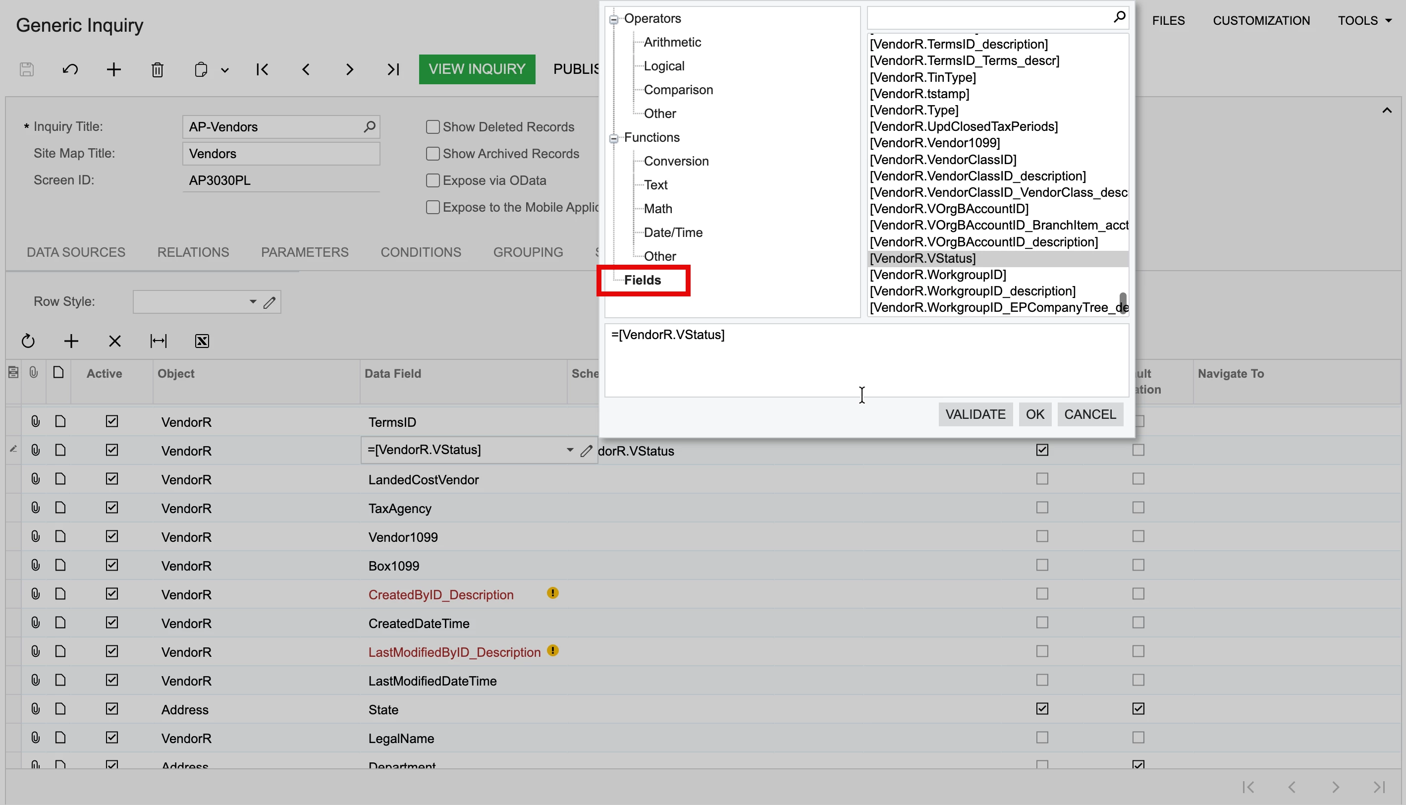 Does anyone know our VENDOR GENERIC INQUIRY would have a column for CUSTOMER STATUS rather than VENDOR STATUS? The Vendor status also does not appear in the list of fields that can be selected to be visible in the report edit options.