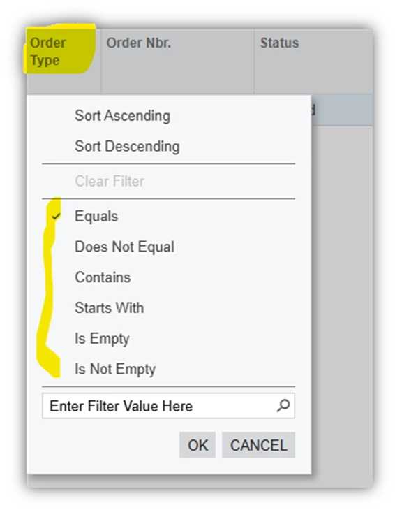 …while other fields like Order Type only list generic operators and prompt you for a filter value?
