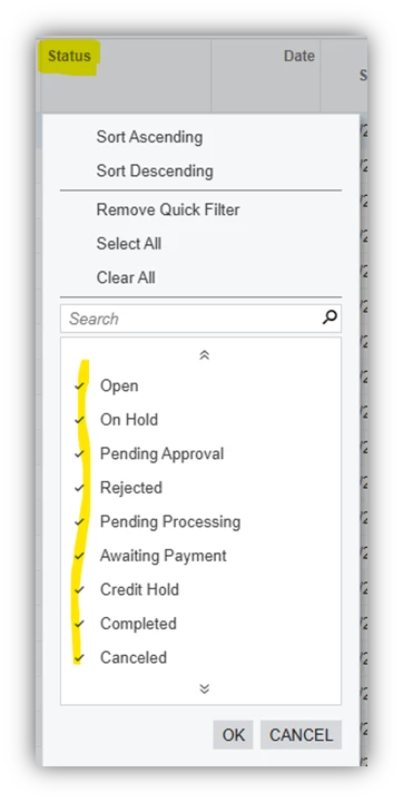 For any GI results page like the stock Sales Order screen (SO3010PL), why do some fields allow you to filter by checking or unchecking specific values like the Status column does…