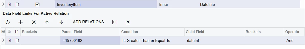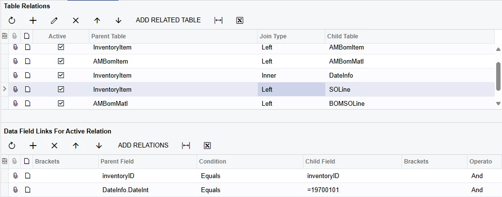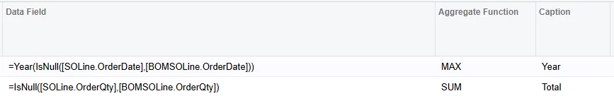 Even though SOLine has all the data I want, I restructured the GI to include a second SOLine reference, aliased BOMSOLine. To prevent these two SOLine joins from causing record duplication, I employed a limited cross join onto (my favorite) DateInfo to create two ‘slots’ for the SOLine data to load into; one for each. This technique is explained in more detail in other posts.