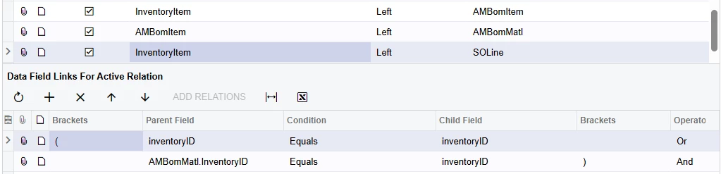 Getting both InventoryIDs onto a single record is established using AMBomItem and AMBomMatl as the intermediary tables. Now, having access to InventoryItem.InventoryID as the cut fabric and AMBomMatl.InventoryID as the uncut fabric, I thought it fairly straightforward to join in SOLine using: