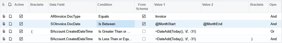 I’m trying to filter “First Invoice Date” and i’m using SOInvoice.DocDate to do so. however, this catches all invoices.