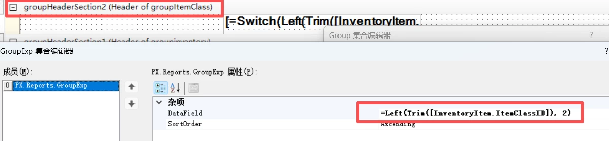 In the Report Designer, I want to group data by the main Item Class. I used this expression in the Group settings:=Left(Trim([InventoryItem.ItemClassID]), 2)