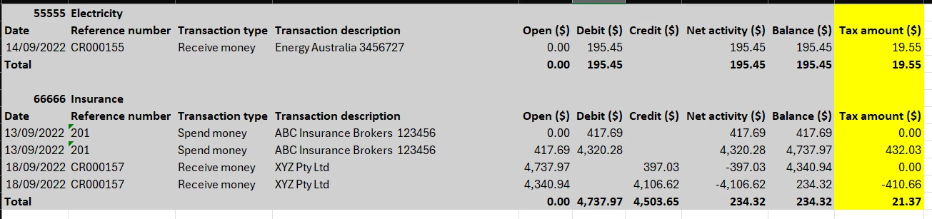 Example of what the report should display (see the yellow highlighted section). You can see straight away that GST has been claimed on everything in the Electricity account and it equals 10% of the net expense, while in the insurance account you can see that some lines have GST and some don’t – which tells me straight away that the stamp duty component has been split out and no GST claimed on that (which is how it should be).