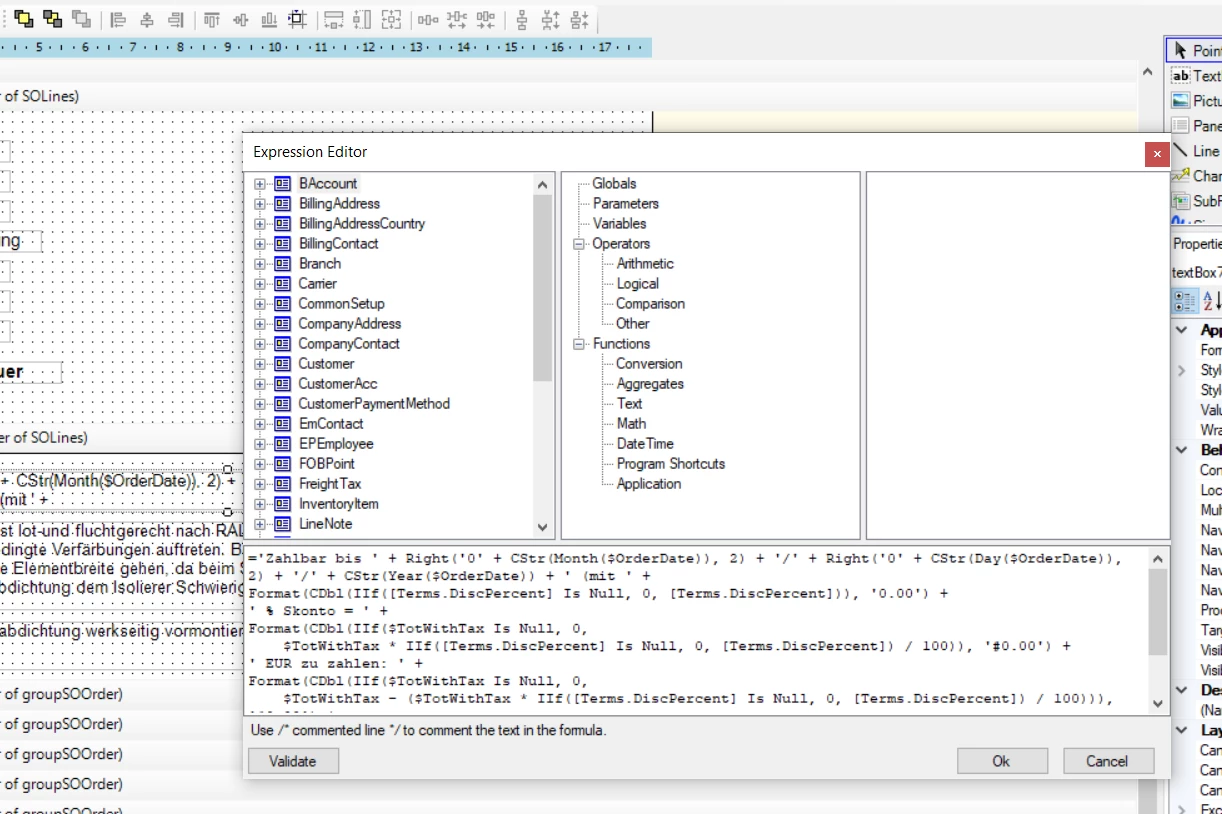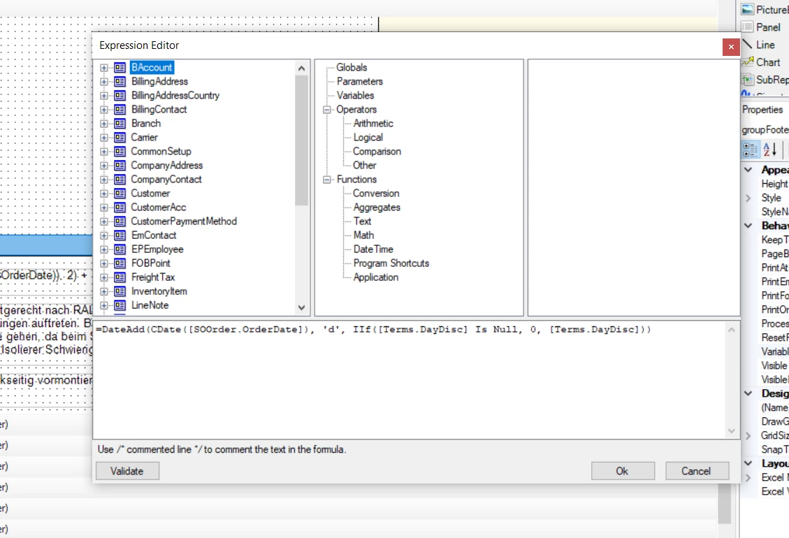 To keep the formula readable, I would define a variable for $DueDate: DateAdd(CDate([SOOrder.OrderDate]), 'd', IIf([Terms.DayDisc] Is Null, 0, [Terms.DayDisc])