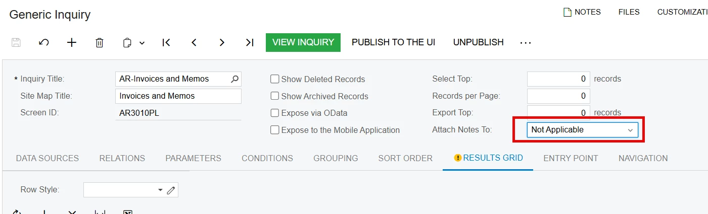 How do I hide the "Files" and "Notes" columns in a generic inquiry? I don’t mean removing default visibility, I mean suppressing them from the results grid altogether.