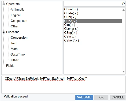 =IIF([ARTran.Cost]>0, CDec([ARTran.ExtPrice]/([ARTran.ExtPrice]-[ARTran.Cost])), '')