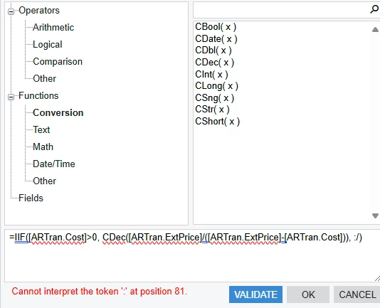 You could put like =IIF([ARTran.Cost]>0, CDec([ARTran.ExtPrice]/([ARTran.ExtPrice]-[ARTran.Cost])), ‘’)