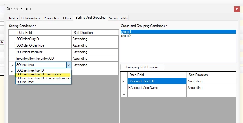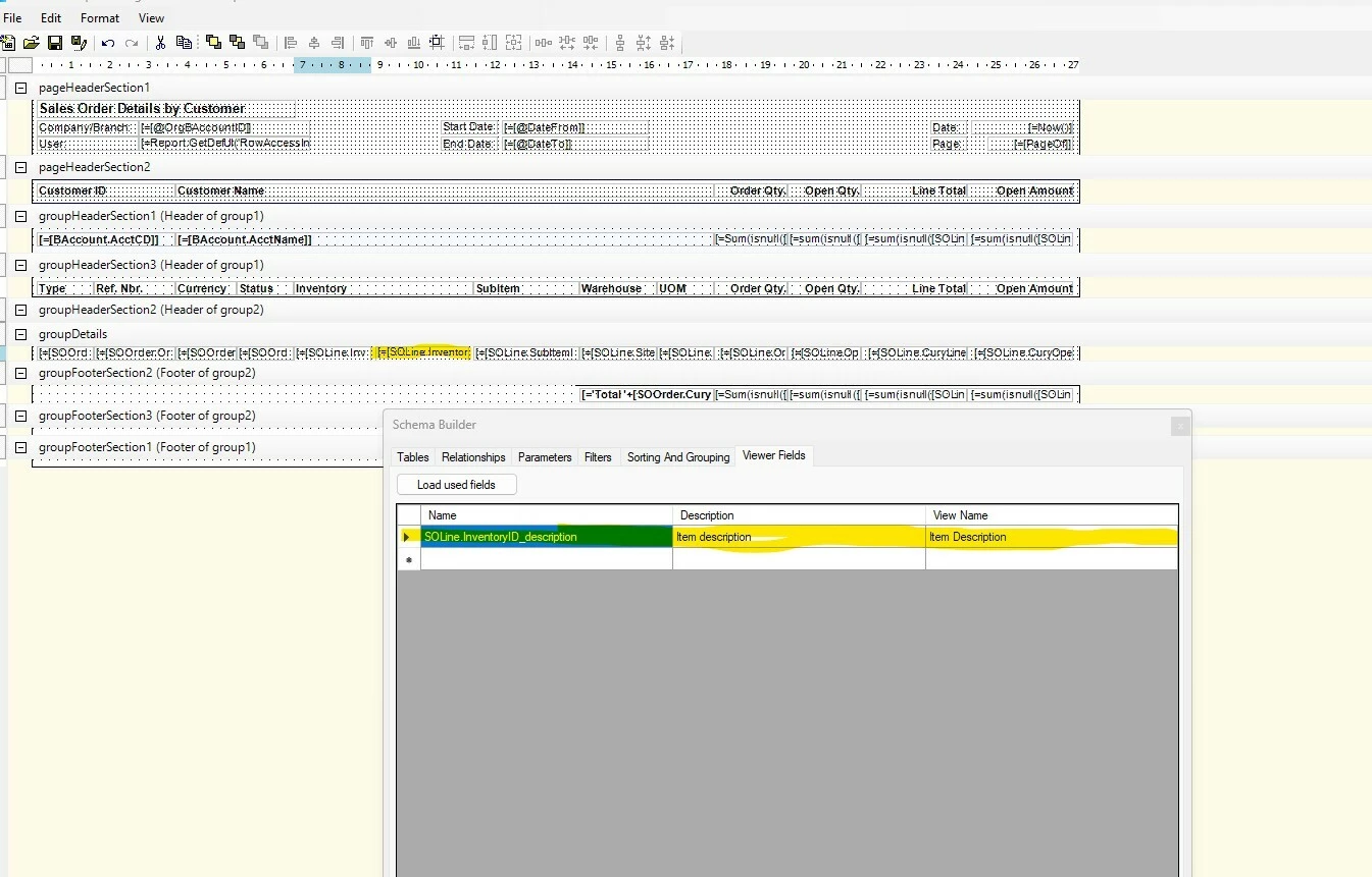 I was hoping to add the ability to filter by SOLine.InventoryID_description in the Sales Order Details by Customer report, but for the life of me i can’t get this field as an option. Following what online tips i could find I added this field to the Viewer Fields in the schema browser. Then I also placed it in the groupDetails section on the report itself at another recommendation.
