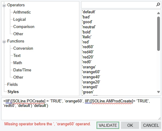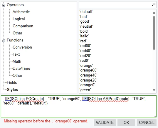=IIF([SOLine.POCreate] = 'TRUE', 'orange60', IIF([SOLine.AMProdCreate]= 'TRUE', 'red60', 'default'), 'default')