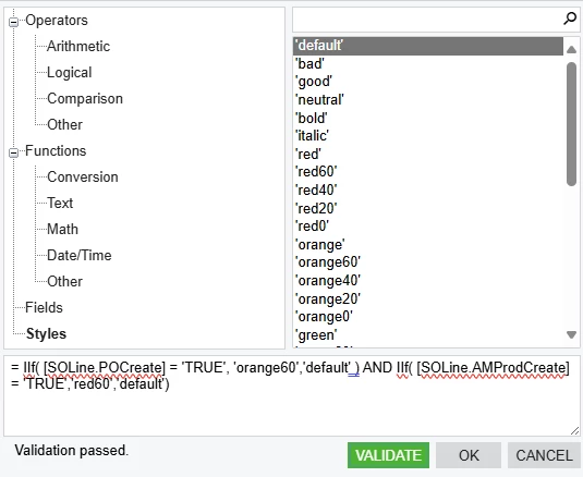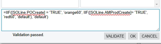 =IIF([SOLine.POCreate] = 'TRUE', 'orange60', IIF([SOLine.AMProdCreate]= 'TRUE', 'red60', 'default'), 'default')