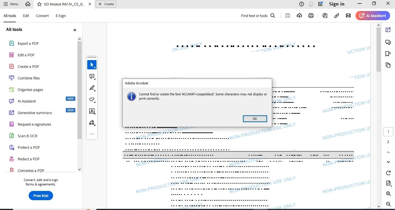We are using Cooper Black and Calibri font in report, whenever we preview the report it shows up fine also the output PDF file works fine in all the browser but when we tries to open the PDF in Acrobat Reader (Adobe) it throws an error “Can not find or create font ‘ACUMAT+Cooper Black’. Some characters may not display or printed correctly” with inappropriate output (Attached screenshot for reference).