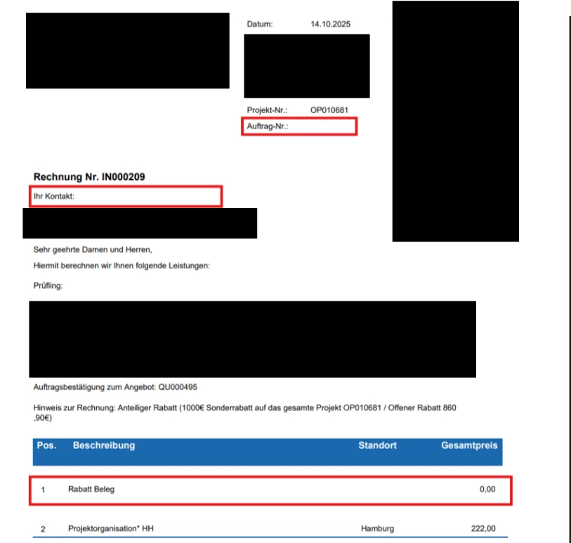 The line numbers in the invoice start incorrectly at 2, because the discount is counted as a regular line item.