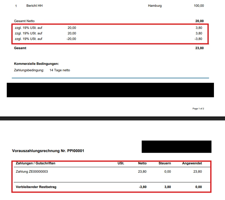 When a prepayment invoice (DocType = PP) is applied to a regular invoice, the tax section in the main report shows multiple tax lines.