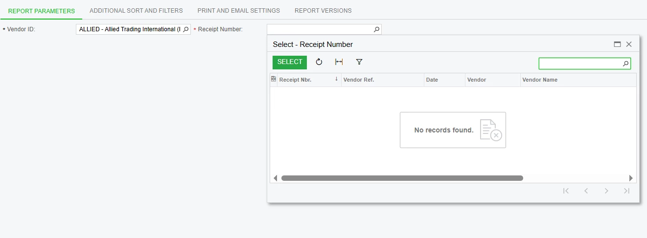I am trying to create a report where I want to filter Receipt numbers based on the Vendor.