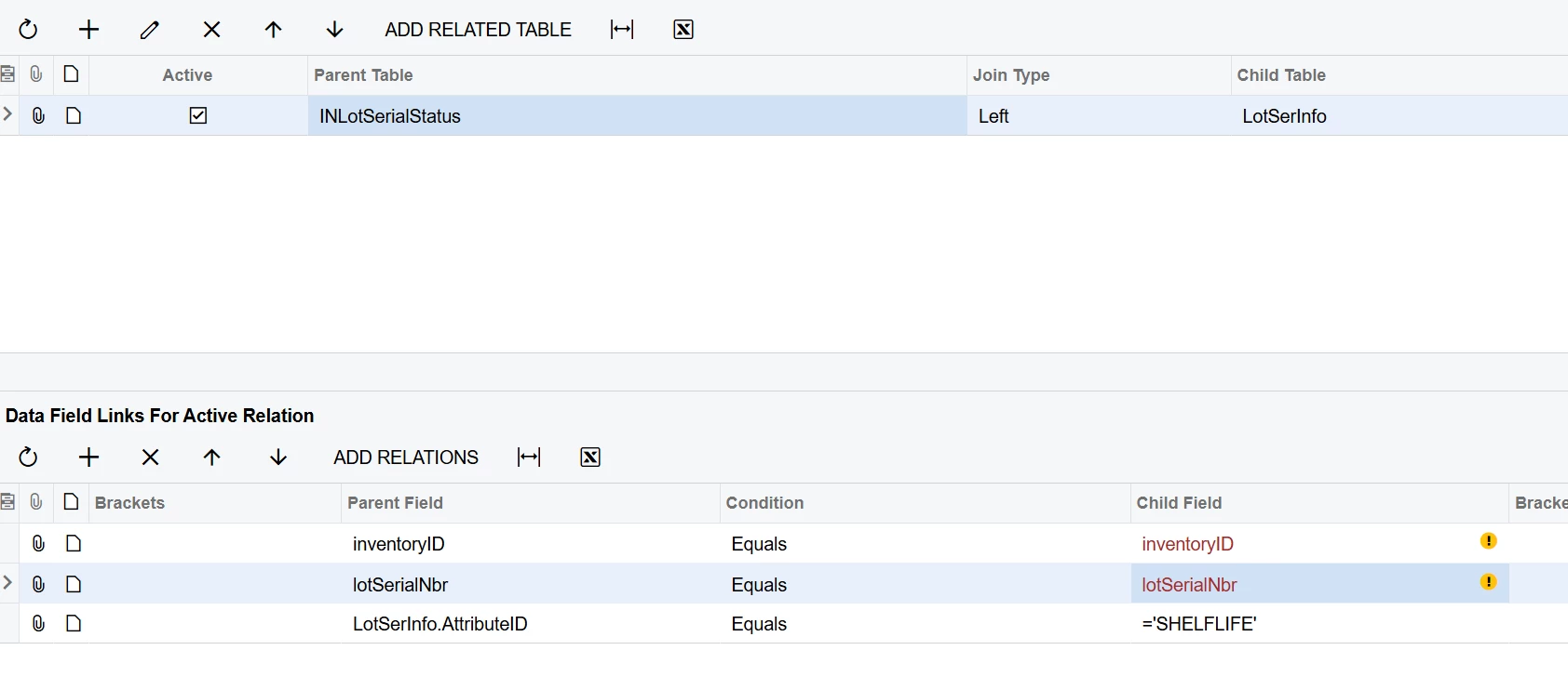 It used to be that you needed to connect to the LotSerInfo table in a join that looks like the screenshot below. For each attribute you needed to create a new join to the lot ser info table (with aliases)