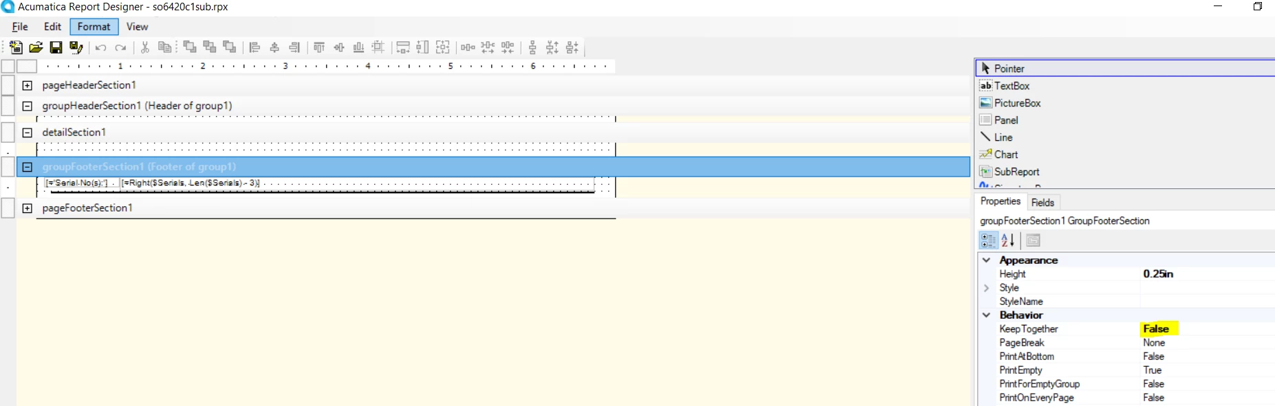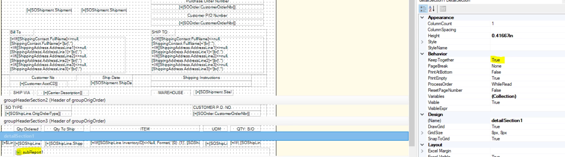 We are using a subreport for a Packing List. There is one item, quantity of over 900, each with its own LotSerialNbr. When printed from the subreport, all of the LotSerialNbr’s print on one long sheet of paper and we would like to break that up into at least two or more pages. I’ve tried using “Keep Together”, “Page Break” to After, Before, BeforeAndAfter, including a =’Page: ‘ + [PageOf]] in the subreport pageFooterSection1.