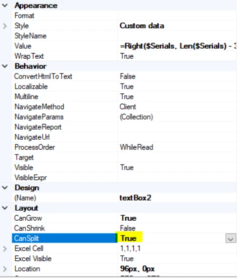 Understood that you need the subreport to paginate. Sorry, the example that I created didn’t have all of the serial numbers on the same shipment line so it was a poor test. With the changes that I posted the subreport should paginate, but it could be that you’re running into issues because the field in the subreport won’t split across pages. For that, make sure that the field in the subreport has CanSplit = True.