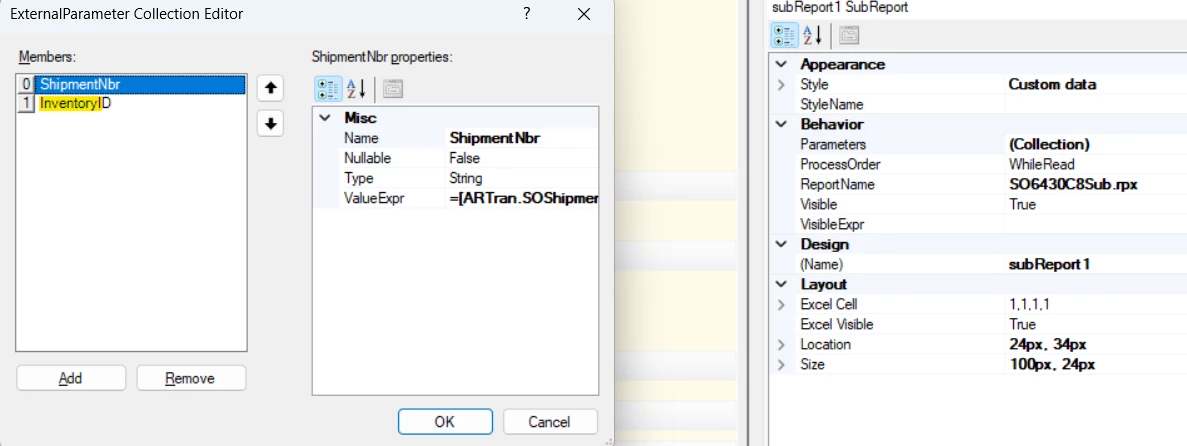We have a subreport for an Invoice that is working fine for the most part. The issue is that sometimes we have a duplicate item, qty of 1, that is listed as “Free”, gets a LotSerialNbr of it’s own. When we have this type of scenario, the LotSerialNbr’s from both get printed with each other. I have attached a Word document and the rpx of the subreport. I’m thinking that it has to do with the linenbr(s) from the subreport, but unable to narrow down as to the why. I’ve already tried passing the main report line numbers to the subreport as a parameter, and in that case all of the lotserialnbrs went away, even the one number that is assigned to the item in line 2.