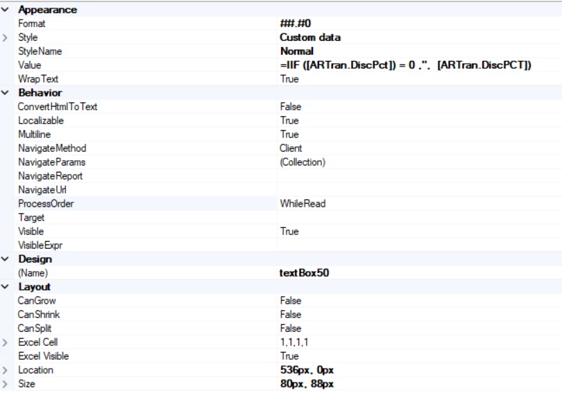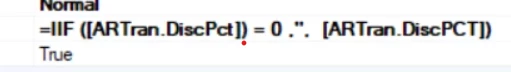 Currently I have =IIF (Null ([ARTran.DiscPct]) ,'', [ARTran.DiscPCT]) . I feel like I’m close but I know I’m missing something. This is being done on the Sales Order invoice but will also be applied to others.