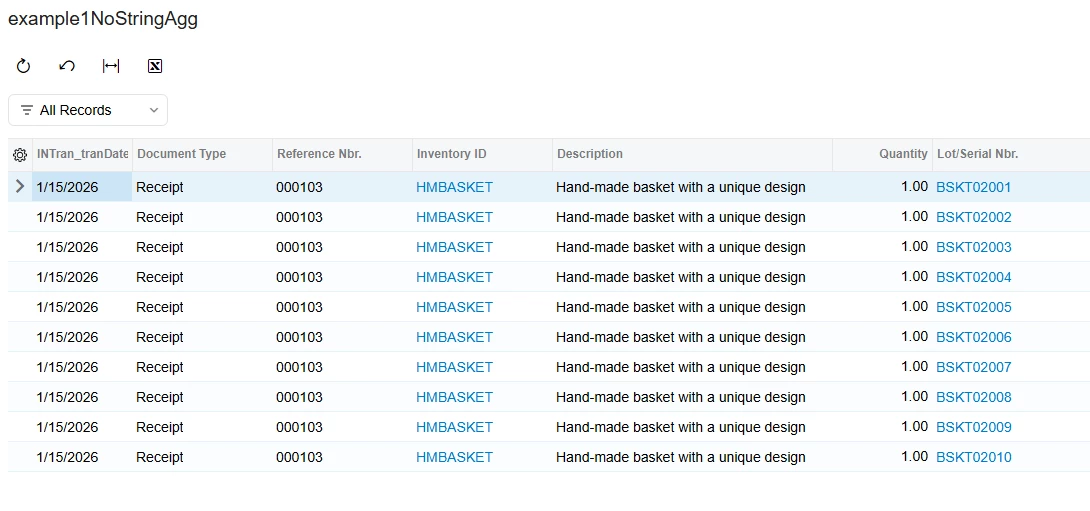 On Results tab, SUM the Qty and add a calculated expression =StringAgg([INTran.LotSerialNbr], ‘,’) in the format of StringAgg( expr, delimiter ). I put ‘,’ in for the delimiter to put a comma in between values.