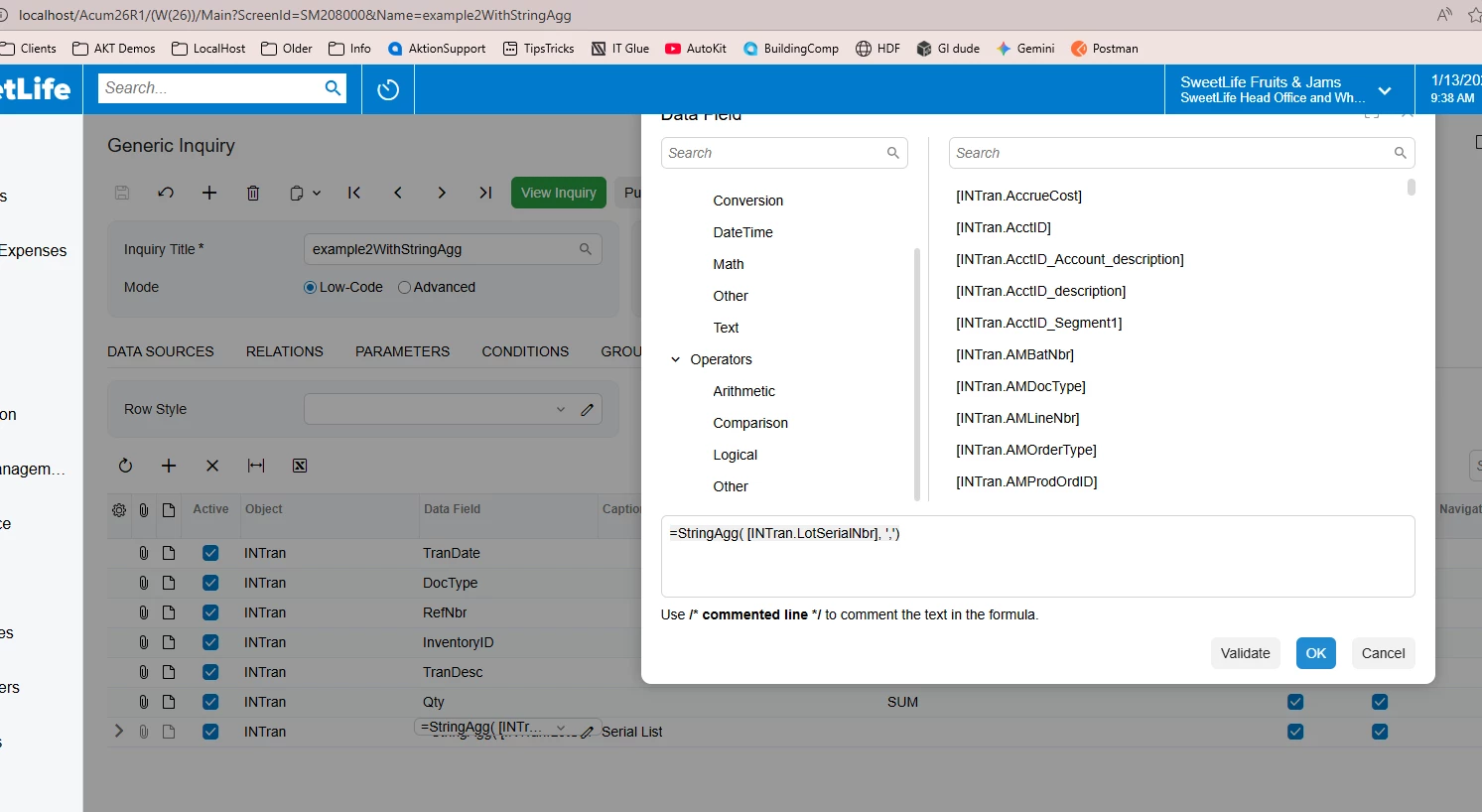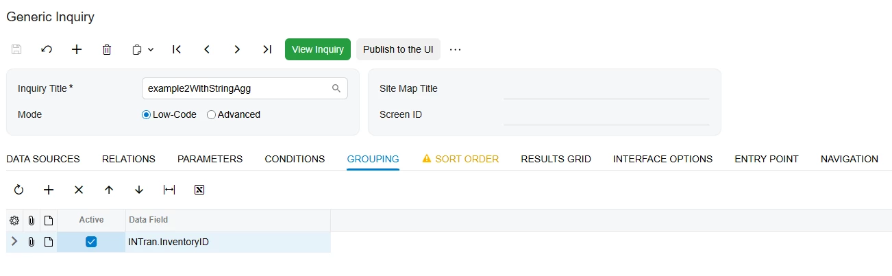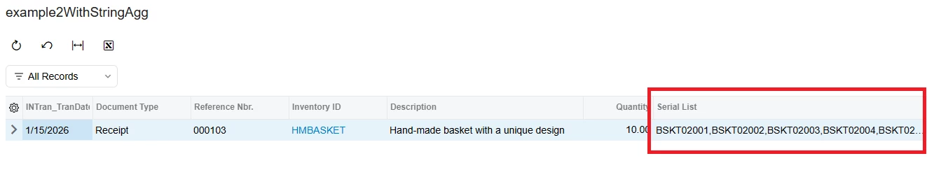 Platform: New Aggregate Function for Flexible Data Presentation in Generic Inquiries Acumatica ERP 2025 R2 introduces a new function for generic inquiries that outputs the aggregated records as a single string. The new StringAgg function retrieves the values of individual records that comprise aggregated data field and concatenates them into a single string. Thus, you can enhance the readability of your data inquiries.
