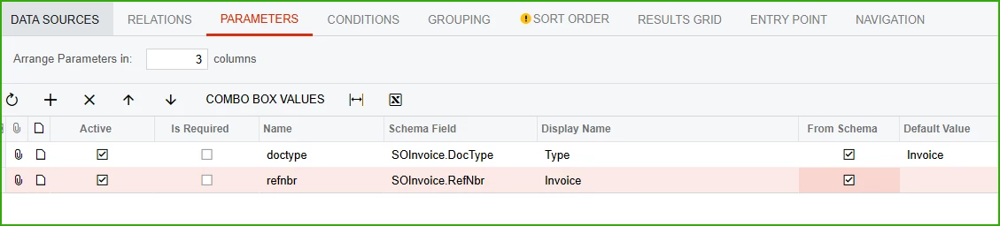 Creating a GI with SOInvoice.DocType and SOInvoice.RefNbr as parameters does not provide a lookup for invoice number. If I use ARInvoice, there is a lookup but it excludes invoices for which the SOInvoice has not been released.