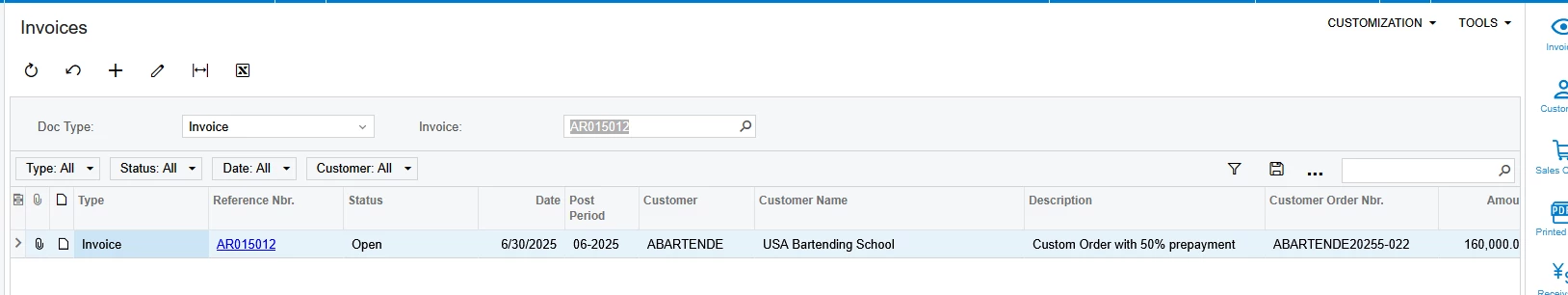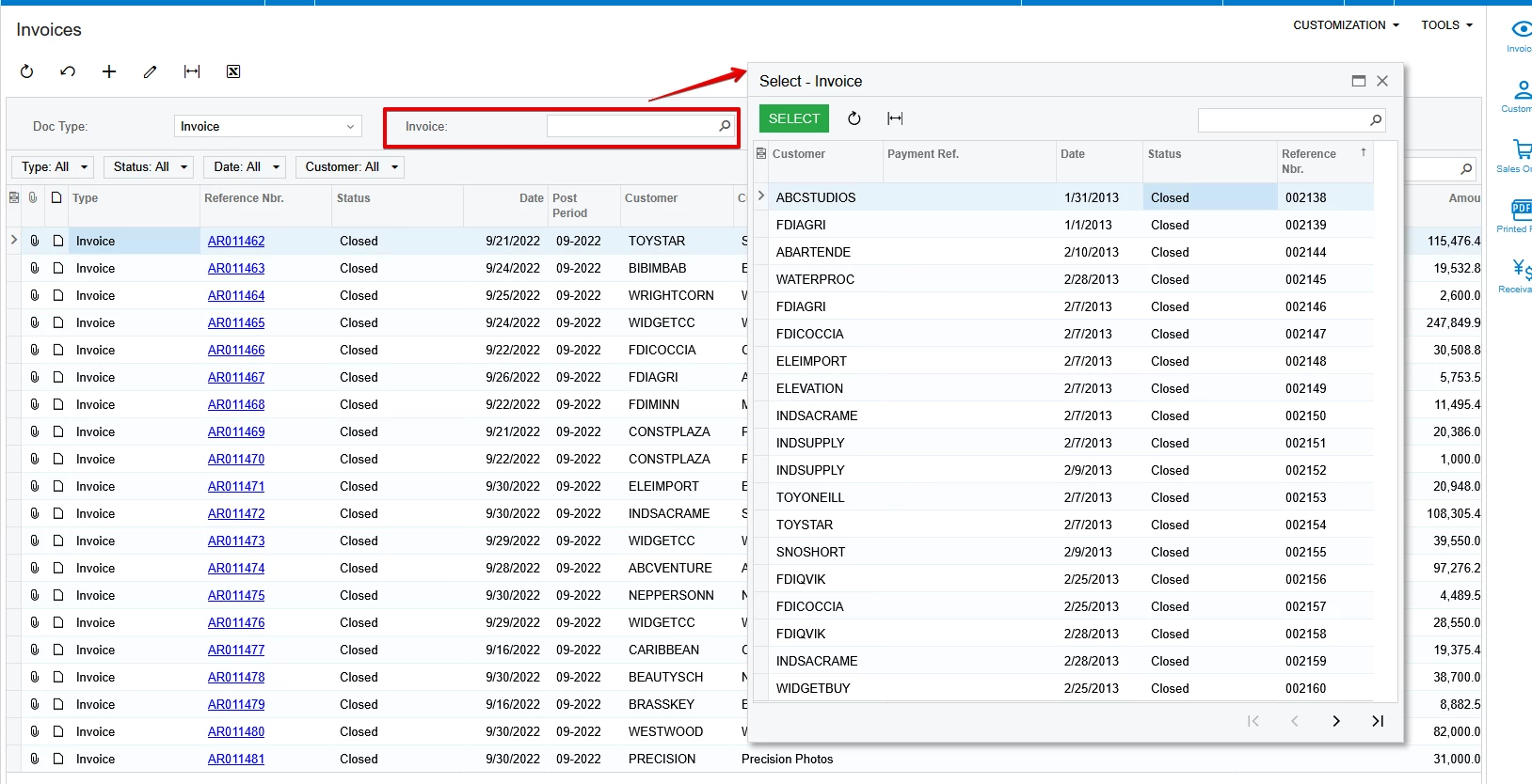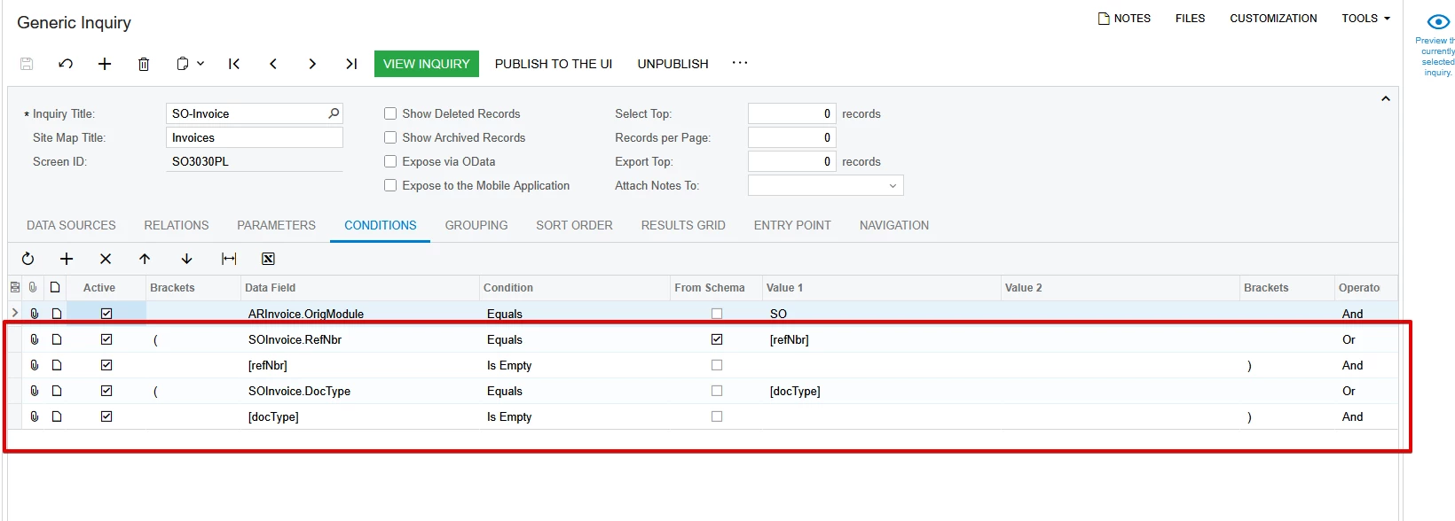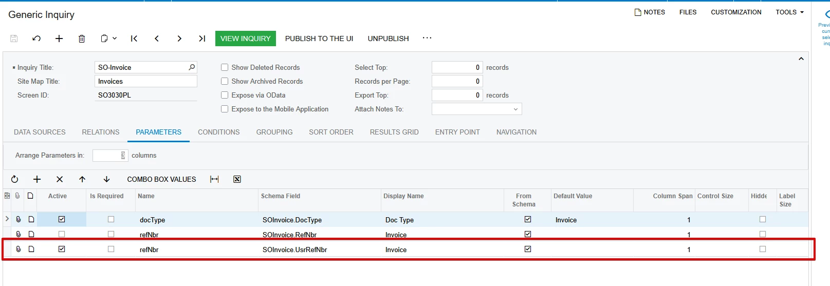Creating a GI with SOInvoice.DocType and SOInvoice.RefNbr as parameters does not provide a lookup for invoice number. If I use ARInvoice, there is a lookup but it excludes invoices for which the SOInvoice has not been released.