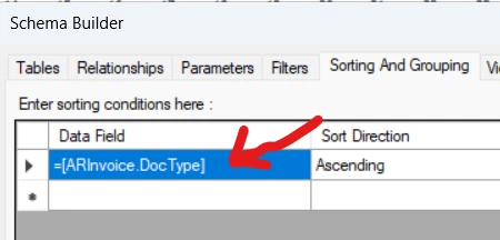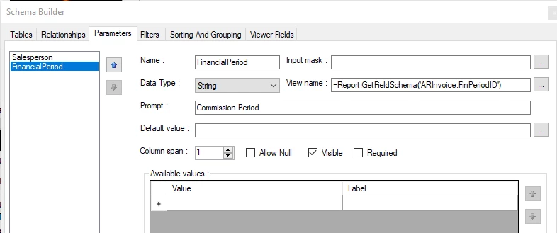 - When @Financial Period did not work, we tried a database field in the Parameters collection, [ARInvoice.FinPeriod], with no success.