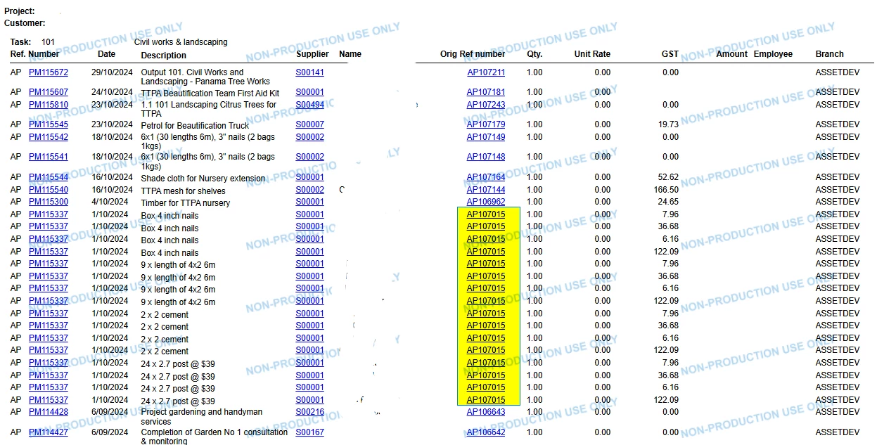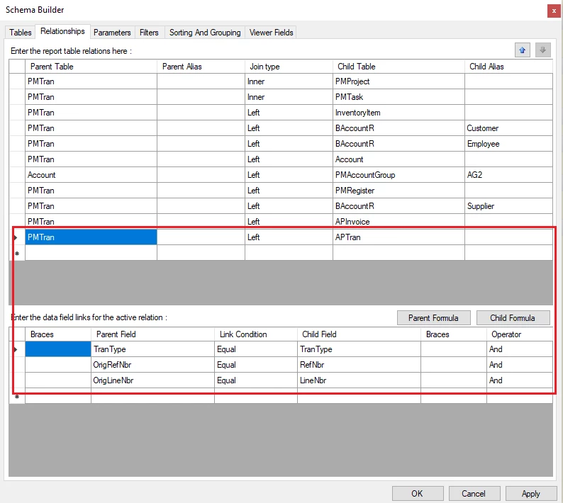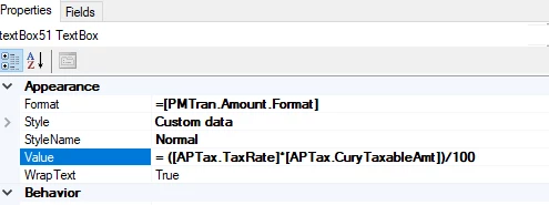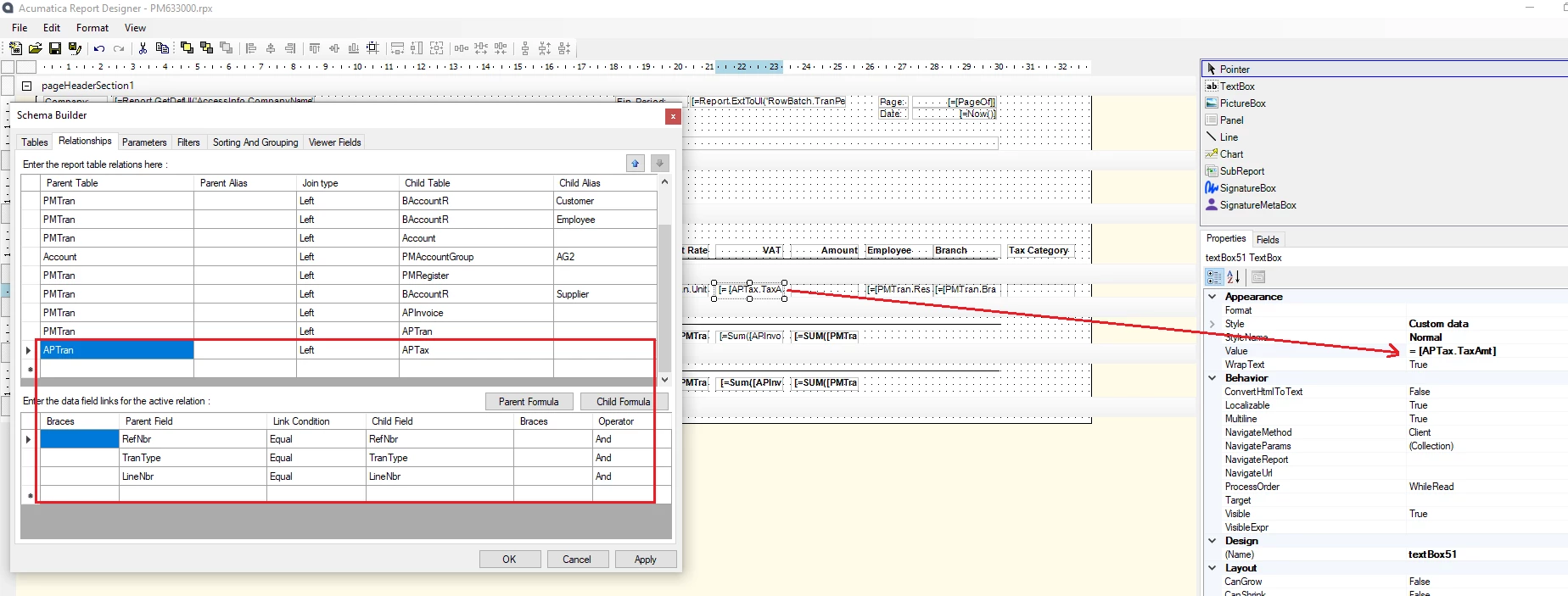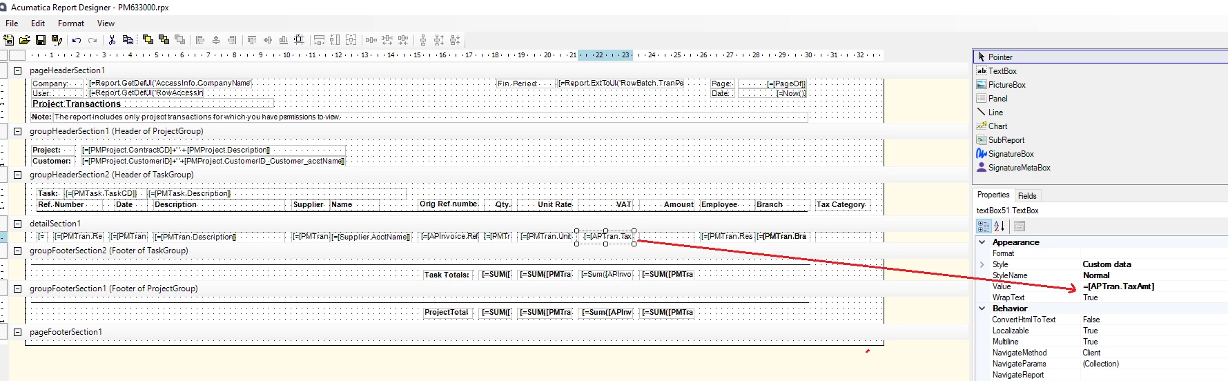I've joined the APInvoice table with the APTran table to display the line-level tax amounts in the Project Transaction Register report.