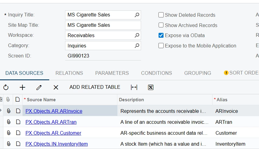 However, when connecting to the Acumatica instance from Power BI using the OData feed, this specific GI does not appear in the available list.