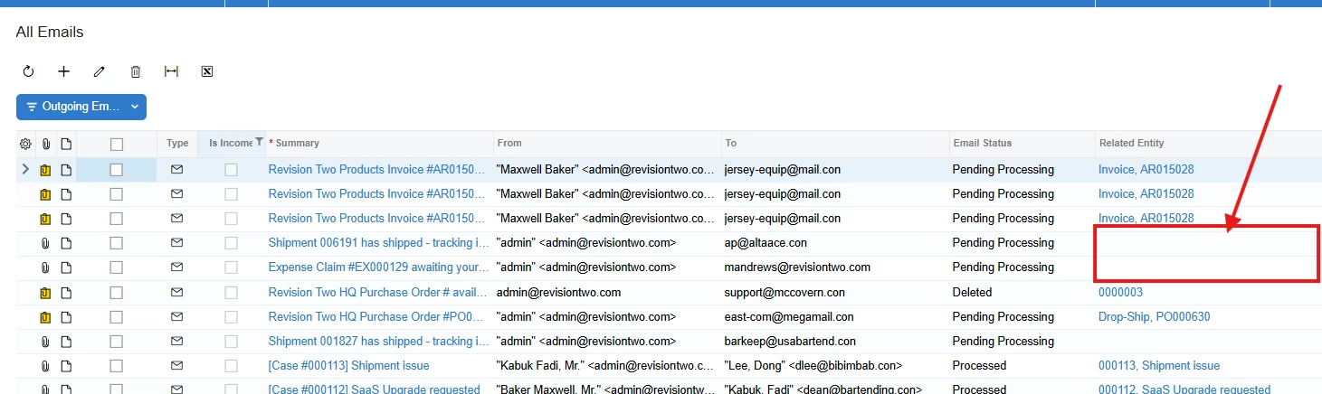Could you please assist if there is a setting I am missing that would display the information in the related entity column on the All Emails screen? See the sample screenshot.