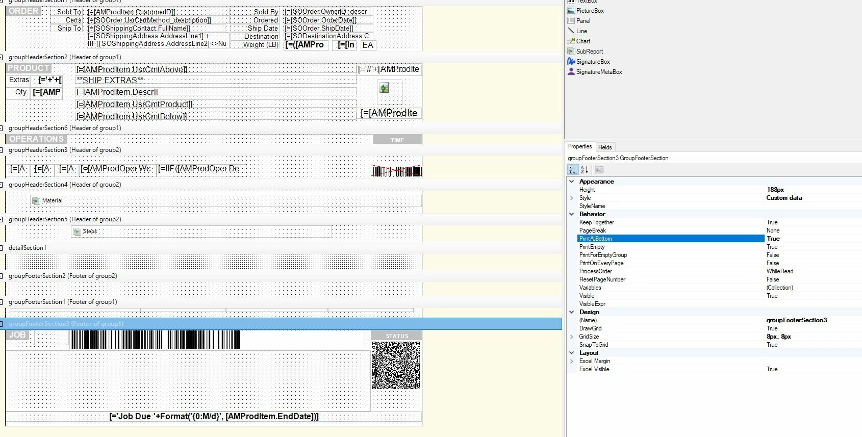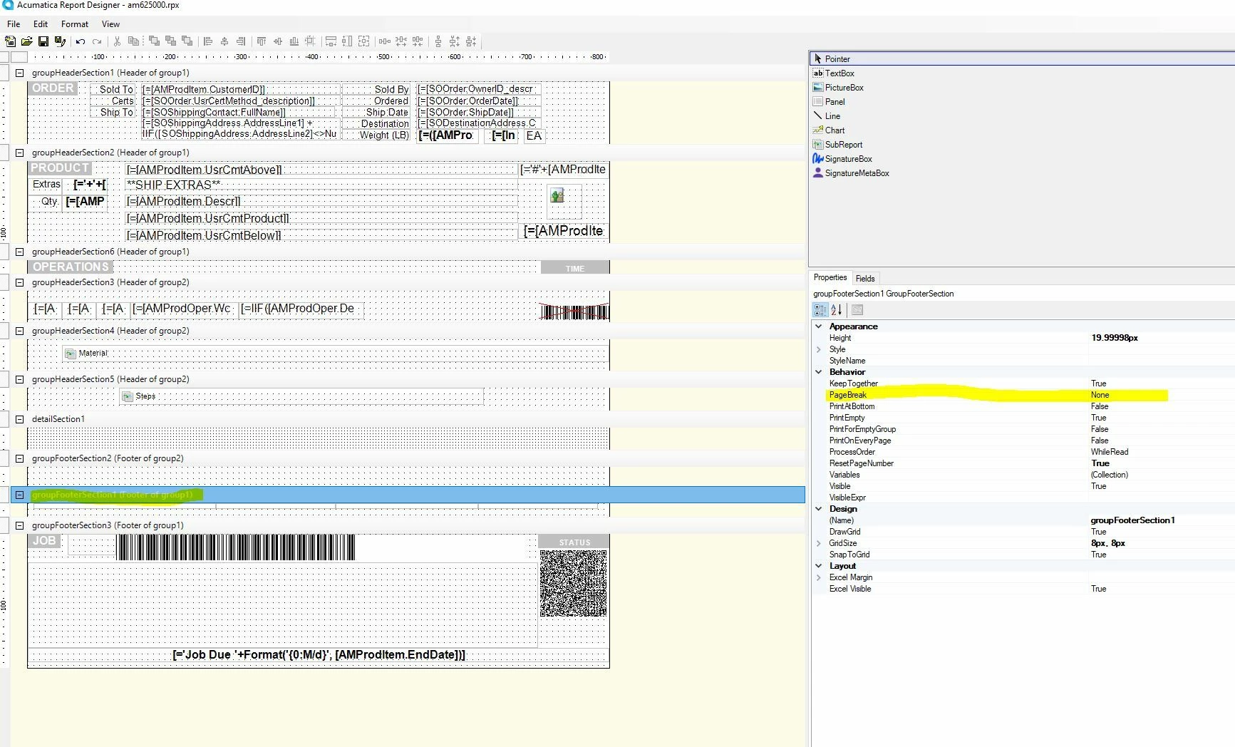 While trying to edit the production ticket, I created two footers for group1. My goal is to put groupFooterSection3 at the bottom of the page, but the report designer automatically creates a page break between groupFooterSection1 and groupFooterSection3.