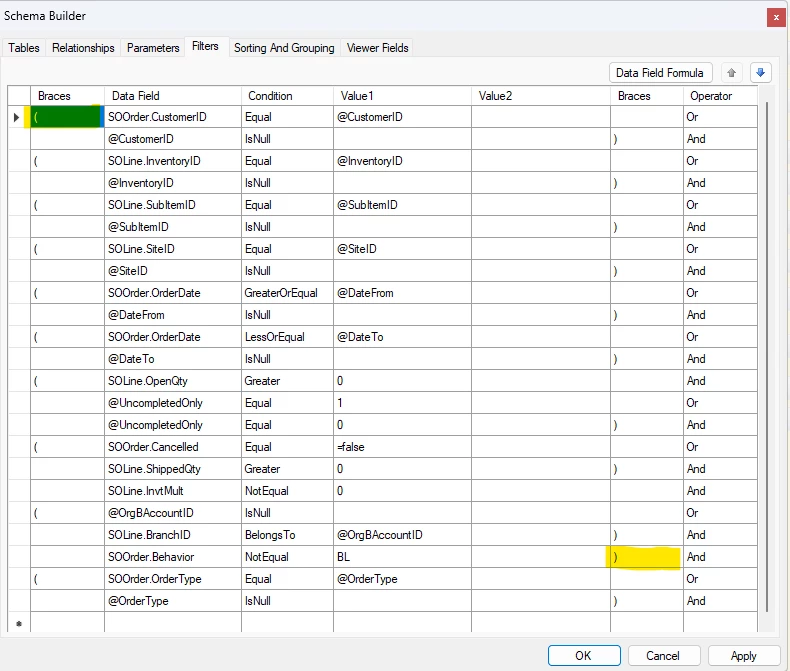 I had a parameter added to the AR Aging report based on a new Attribute.  I had the report working when adding the new Attribute to the parameter, but didn’t pull in data if you selected a specific customer instead of picking the Attribute.  Now, when I try to fix it, the ability to select a customer works, but the Attribute Parameter does not.