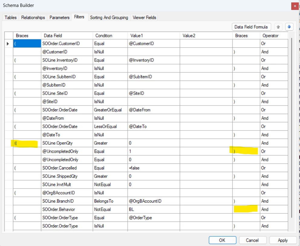 Sorry, missed that you need a double parenthesis before SOLine.OpenQty (two lines above the previous)