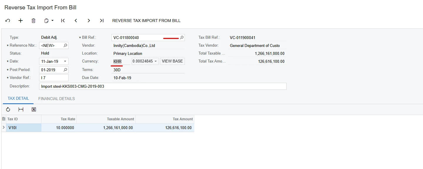 In the form of reverse Tax import from Bill. when select bill that usd currency but in current field of form it displays khr currency. please advise me how to make the currency from bill