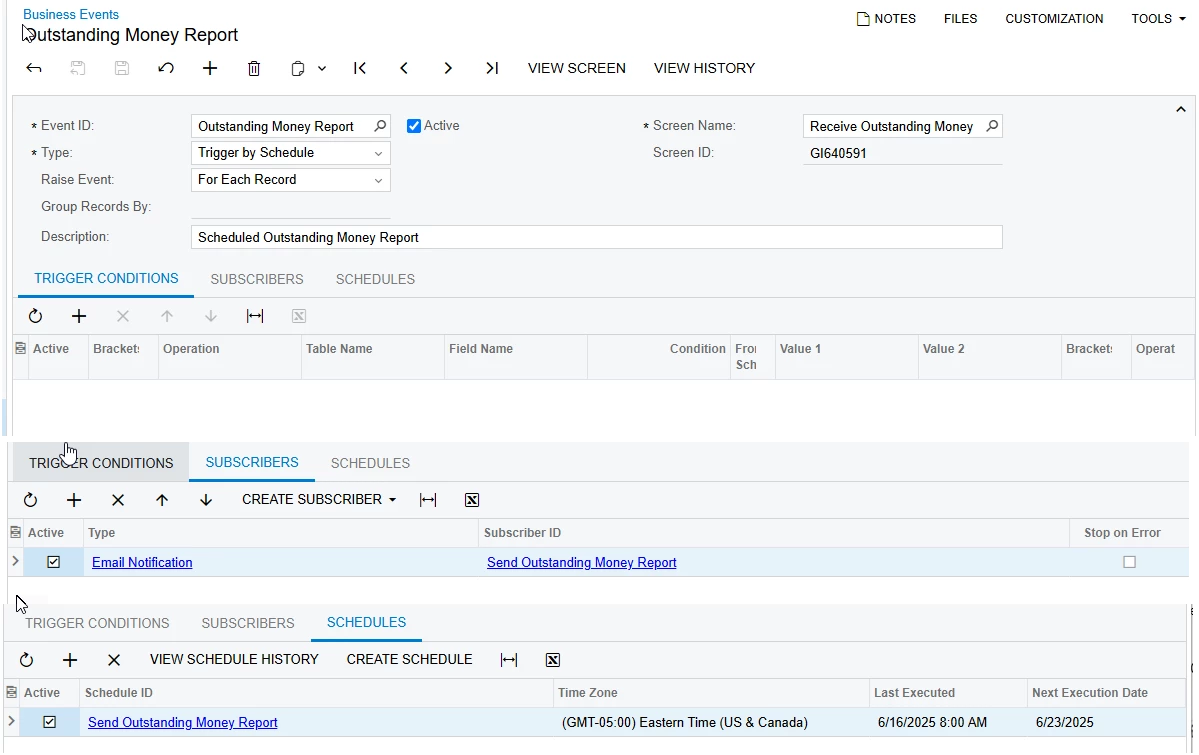 This report just needs to be emailed to a person (or various people) on a scheduled basis. The Business Event screen requires a Generic Inquiry to create a schedule but all I want to do is email the report to an email address that may not be set up in Acumatica). This was being done with a Template on the report and then scheduling it with the Automation Schedule screen using the Send Reports screen. Can someone confirm whether or not this is still supported as it has been working but we are upgrading them to 2022 R2 and I don’t want to run into issues that I can’t get support for.